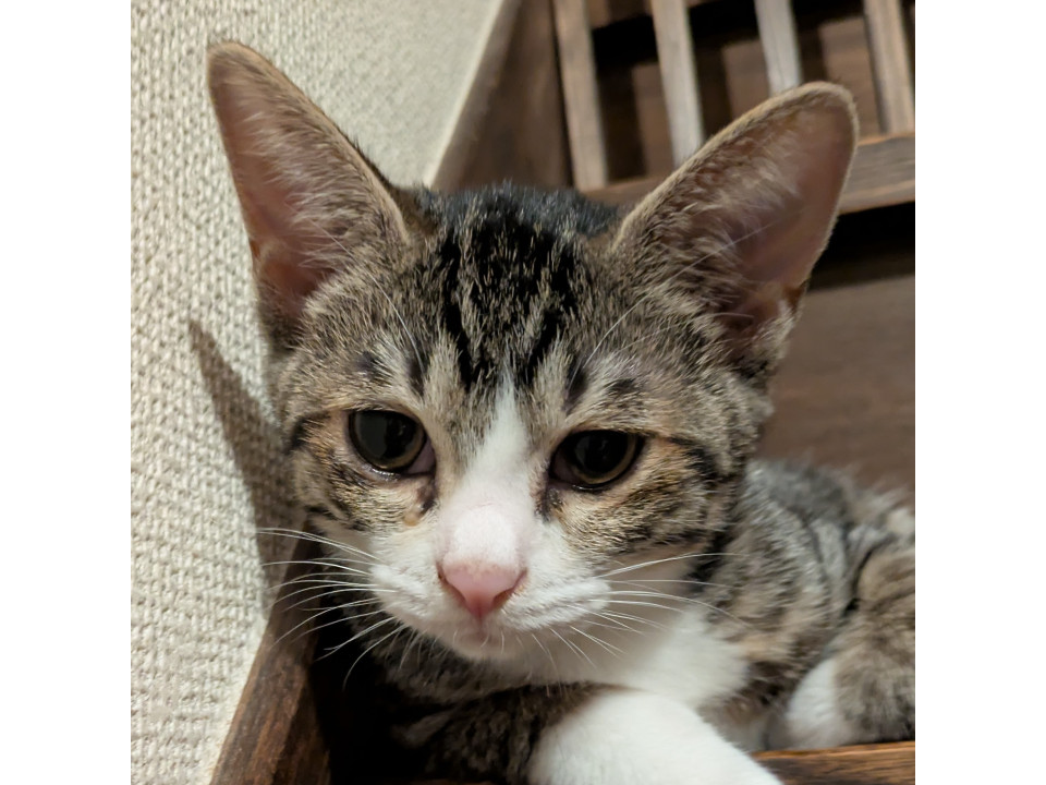 子猫にしては切れ長のタレ目で、不機嫌な表情のように見えますが、本人はいつでもゴキゲン。