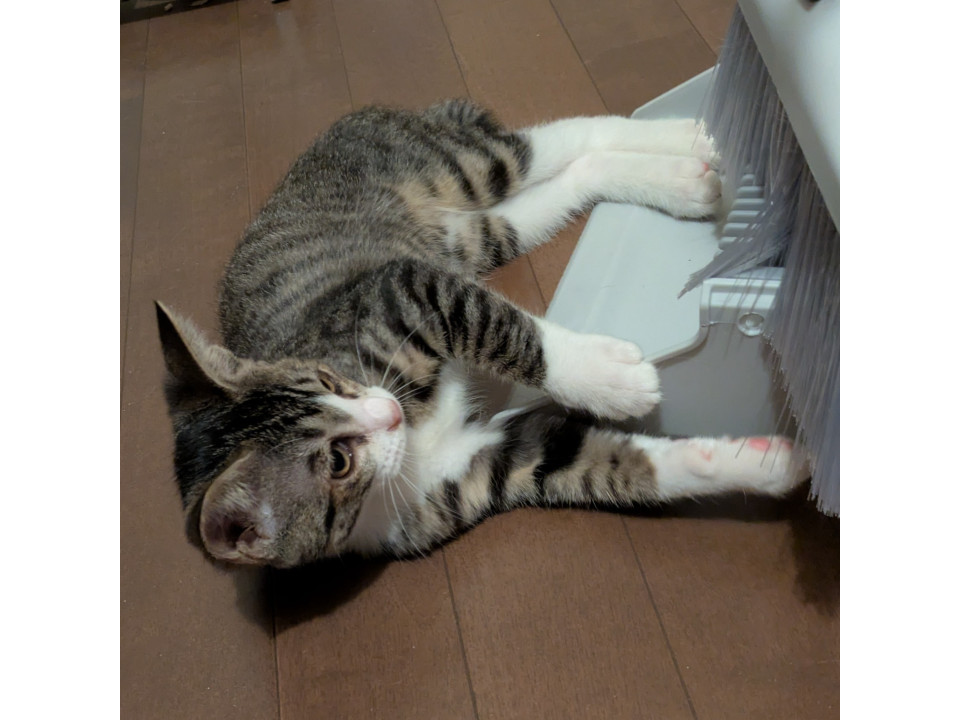2カ月ほど小さいテン、マル、レアの3姉妹と一緒にいますが、社会性を学ぶ一番大事な時期に隔離中だったため、まだ手加減がわからずににゃんプロを仕掛け、姉妹からクレームをもらってしまいます。