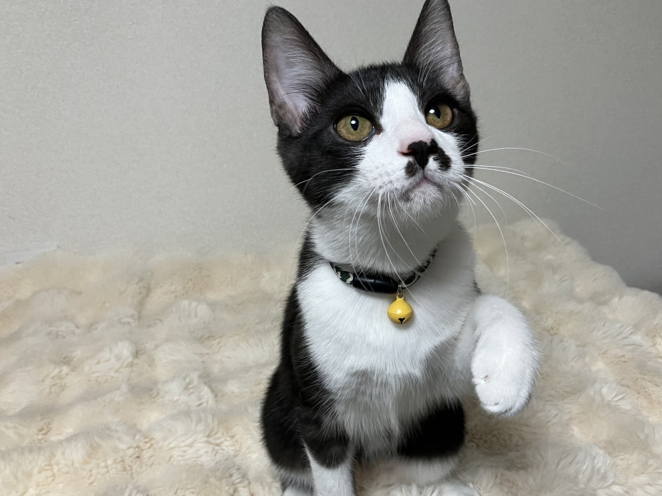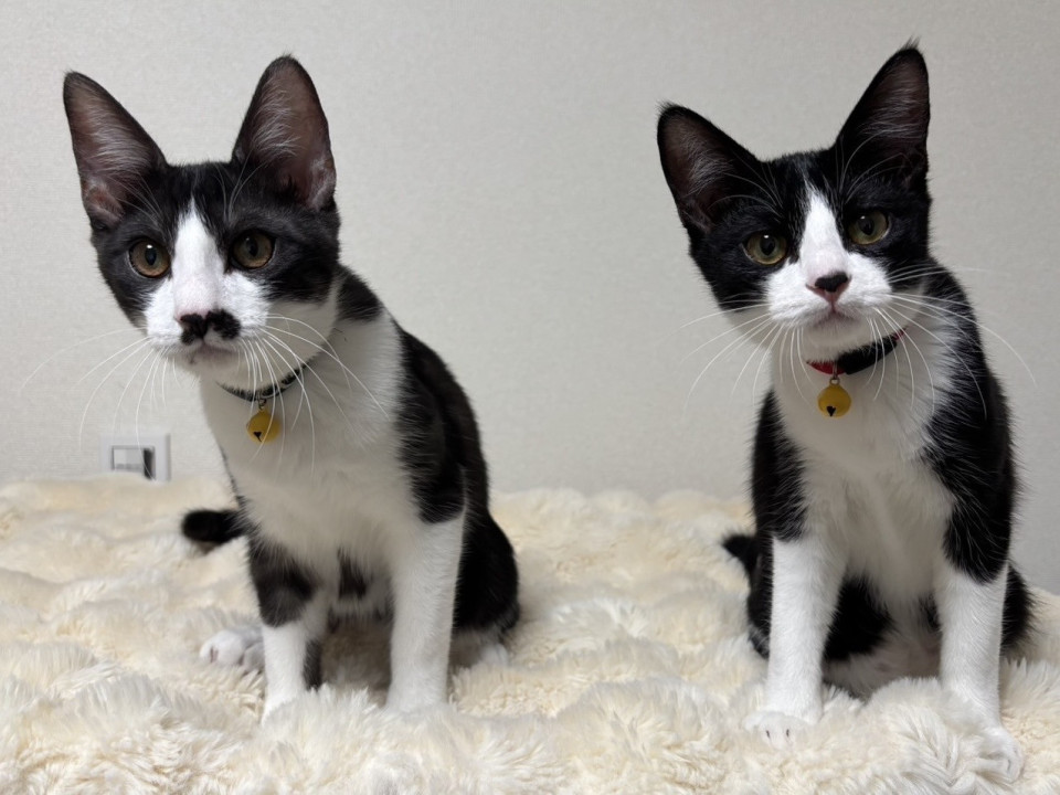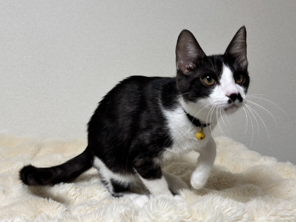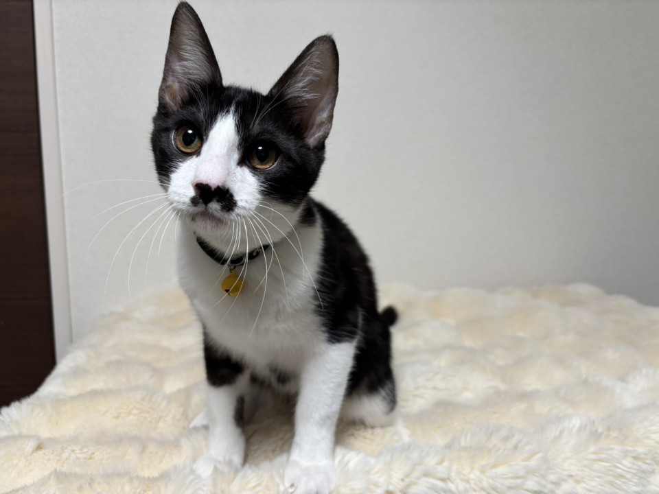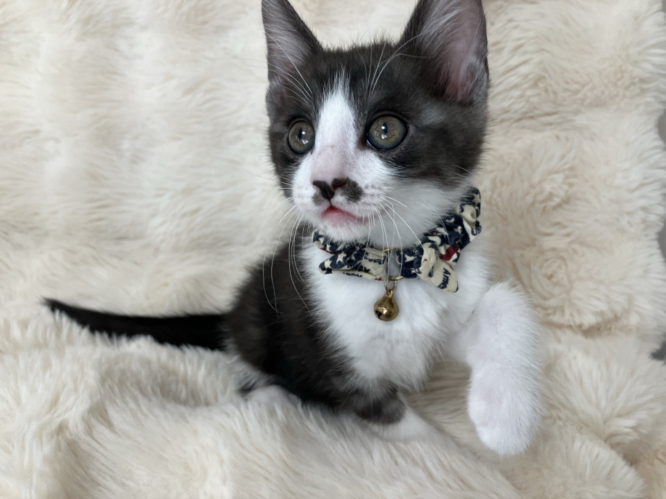 元気いっぱい四兄弟。お口周りの柄が可愛い過ぎです。白黒柄ですが右前脚の淡いトラ柄がアクセント。子猫らしく元気いっぱい遊んで食べて寝て過ごしています