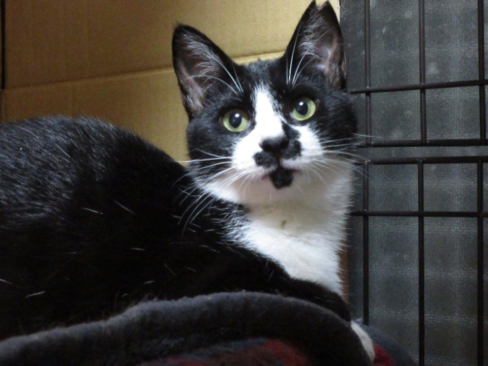 白黒はち割れ、鼻のまわりと下顎の黒いのがチャームポイント♪