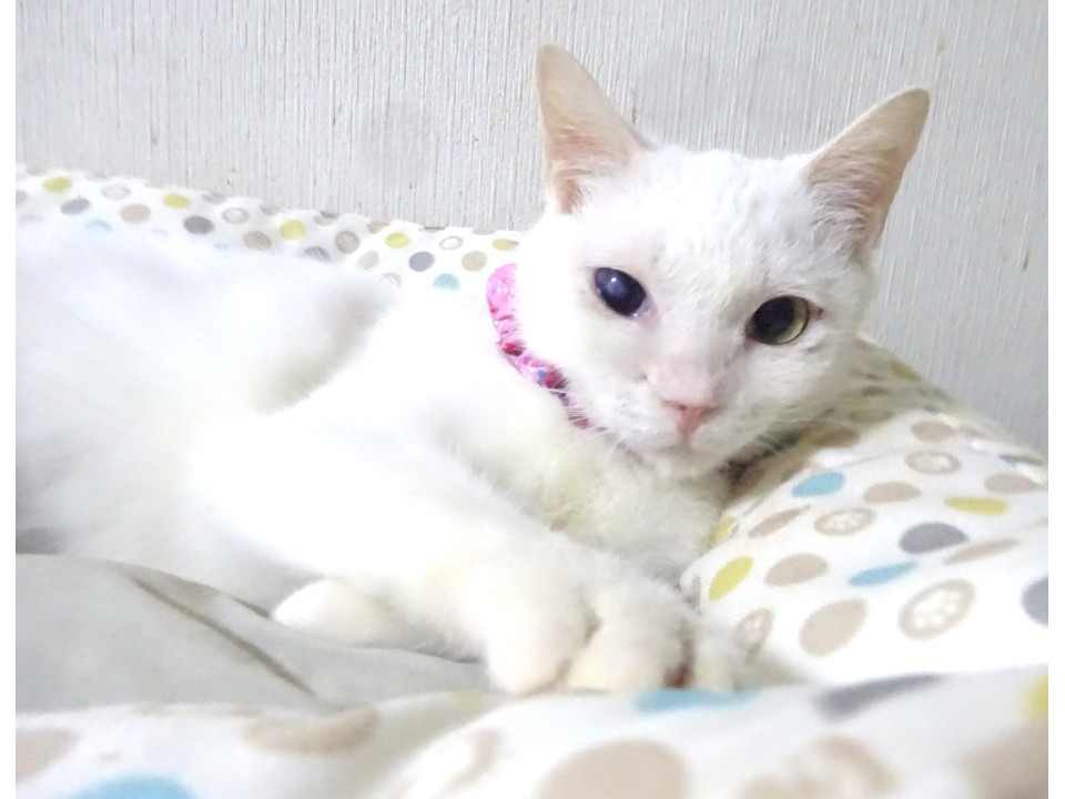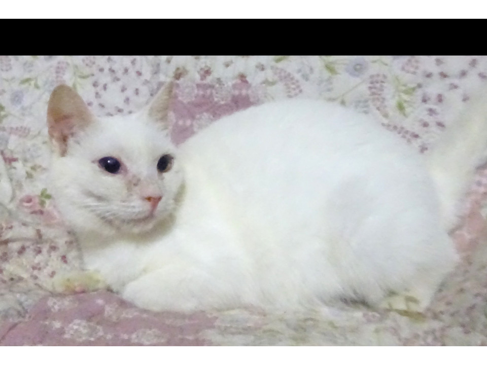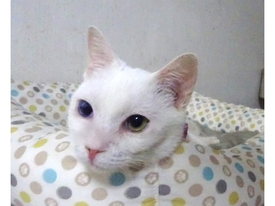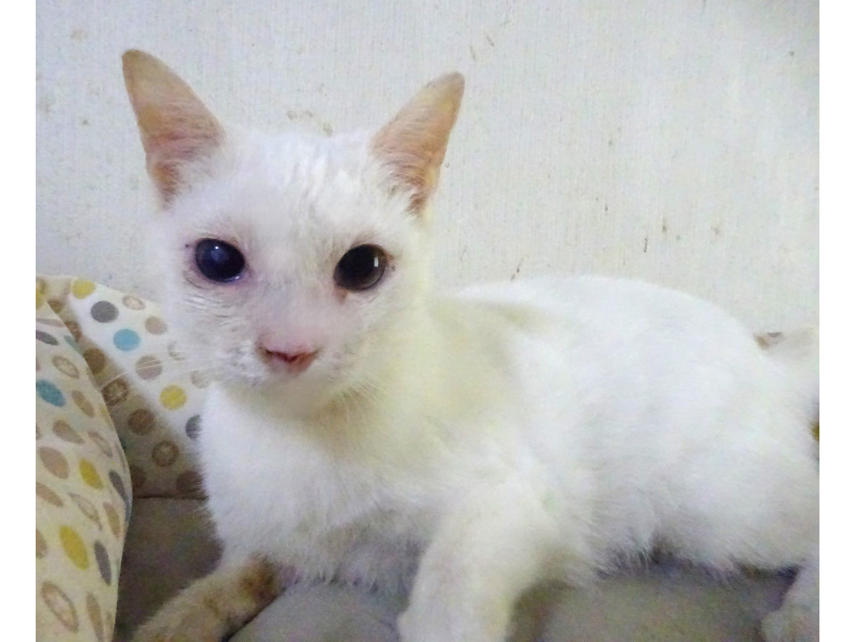 毛色: 白猫、尻尾ながい、オッドアイですが、片目は見えていません。