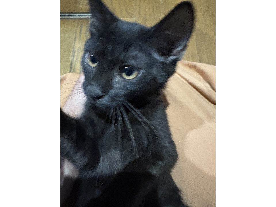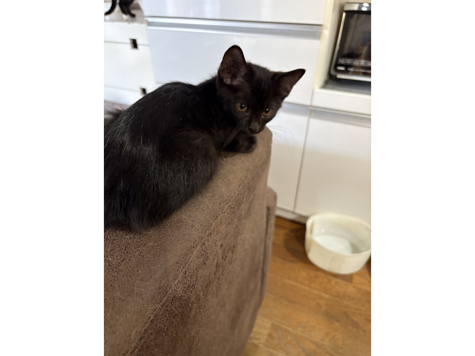 真っ黒で目の色は薄茶色、耳が大きいのが特徴です
