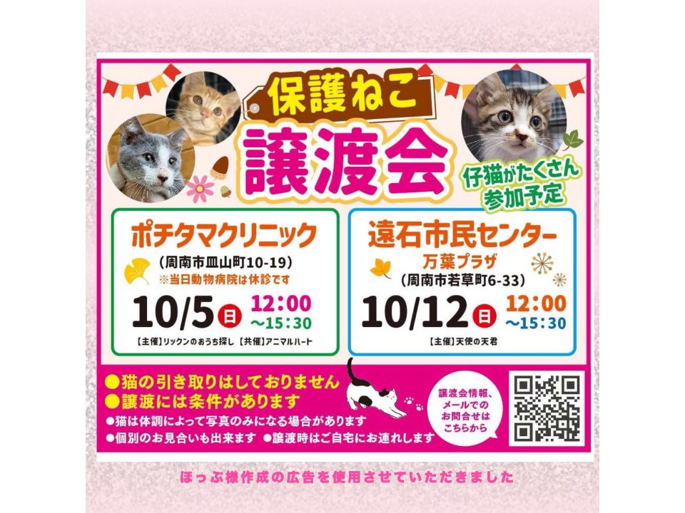 10月5日(日)周南市ポチタマクリニック様、10月12日(日)防府市新田250‐3での譲渡会にも参加予定ですが、個別のお見合いにも対応します。