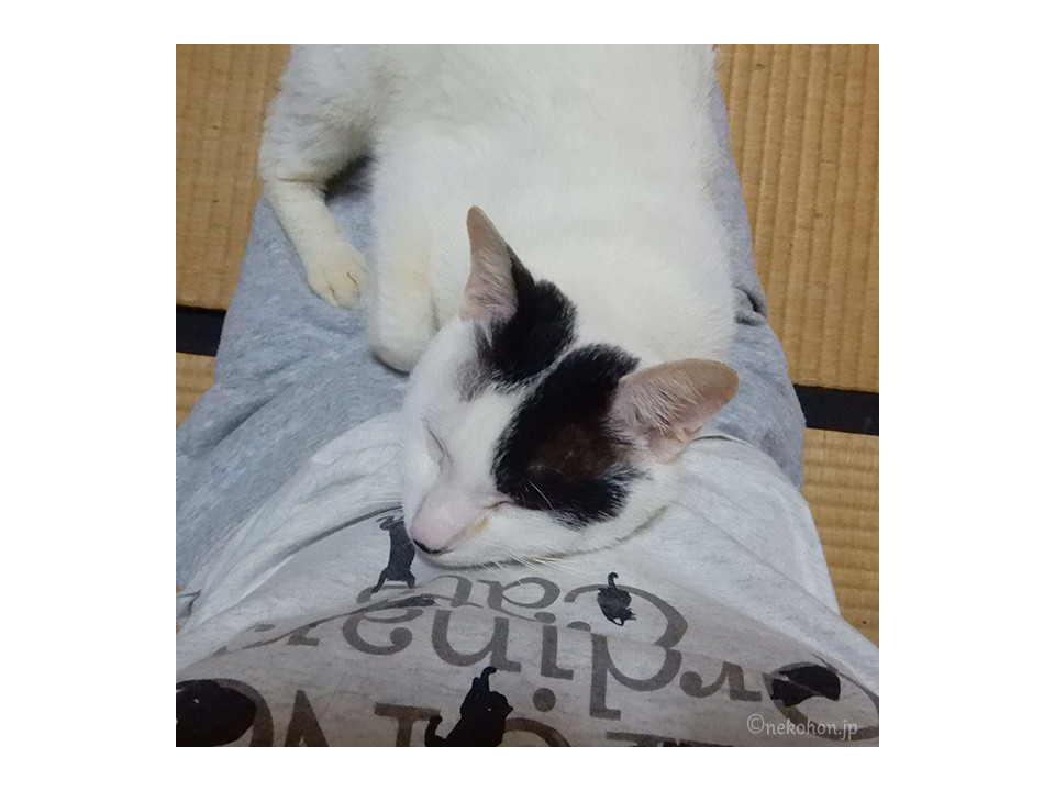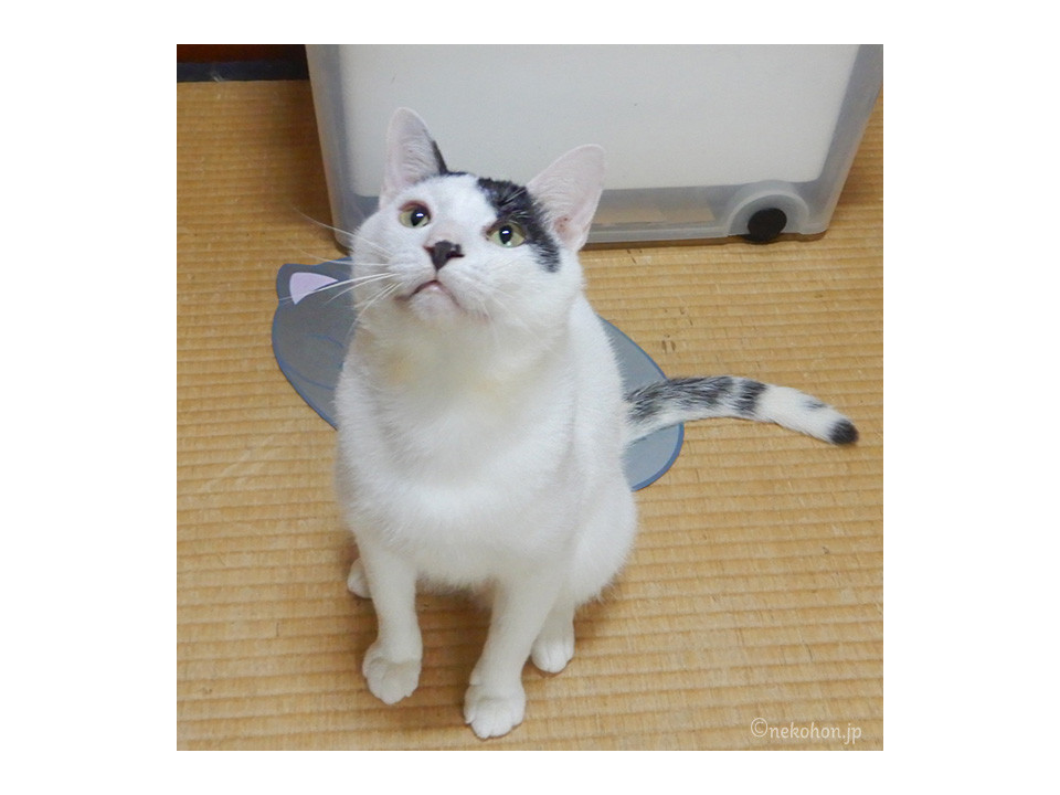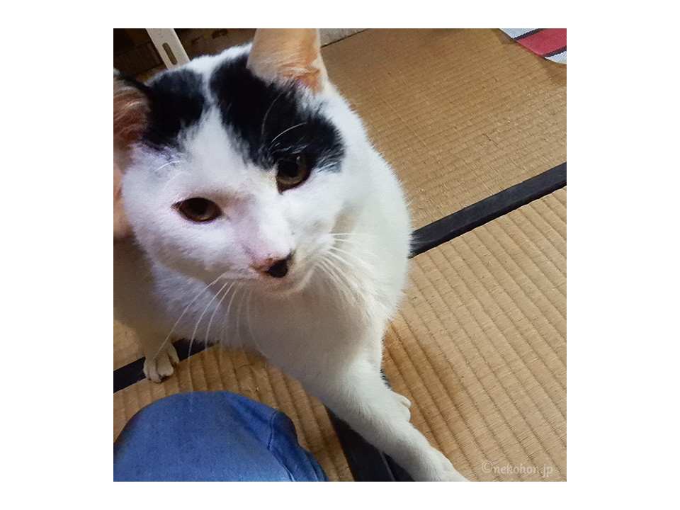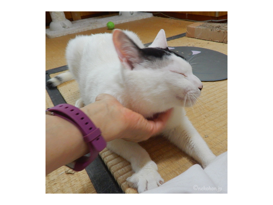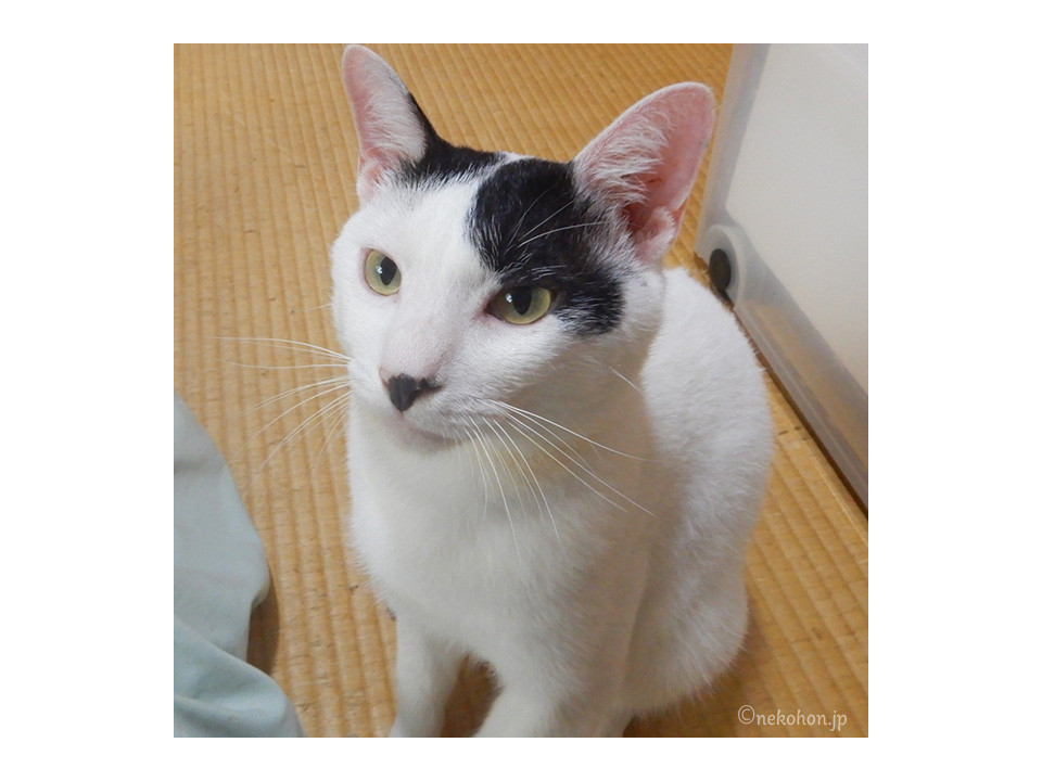 真っ白な体、頭と尾に黒いアクセント。日本画から抜け出てきたような上品内路愛の、きれいな猫です。