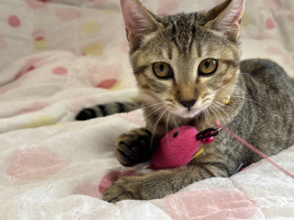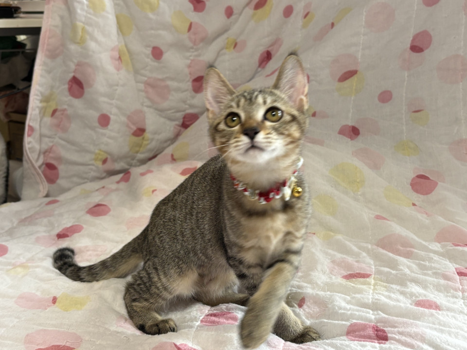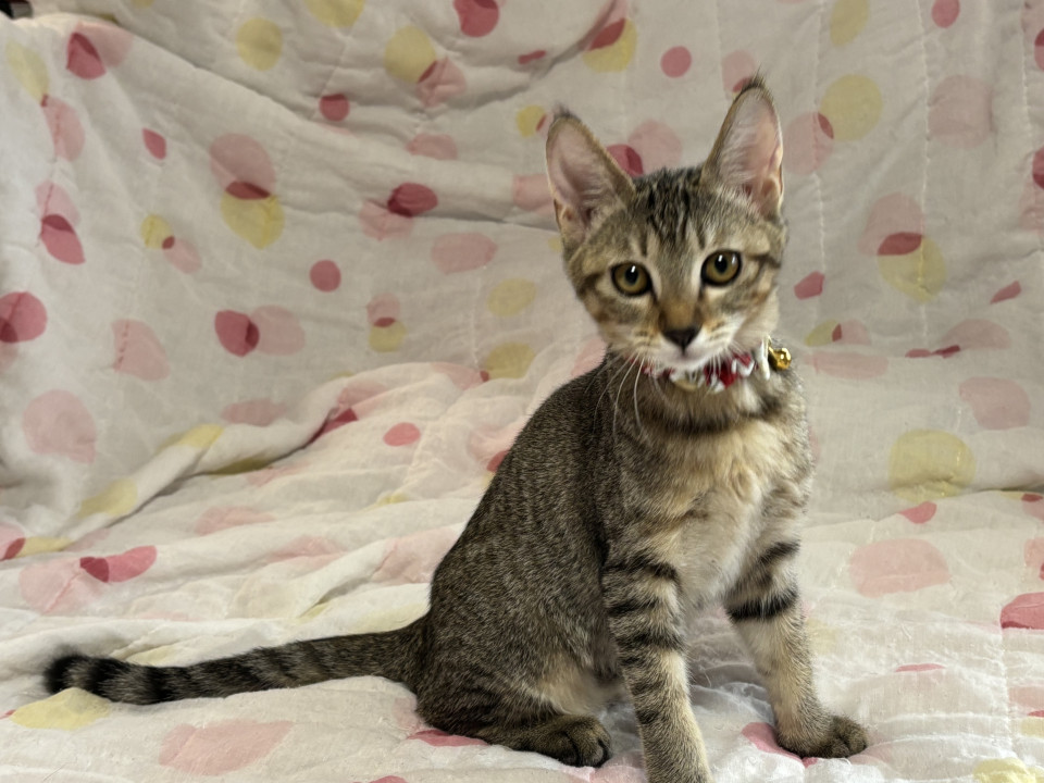 愛らしいキジ柄の女の子。目が半分しか開いていないイメージを受けますが千は目一杯のクルクルのつもりです。元気いっぱい遊んで遊んで食べて寝て。優しい穏やかな子です。