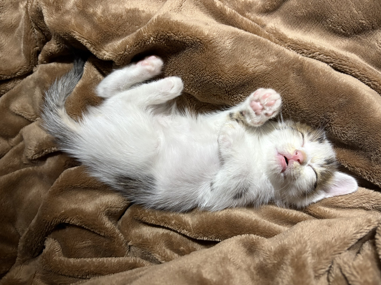 たくさん食べ、たくさん遊び、たくさん寝て元気いっぱいに育っています。兄弟とのじゃれあいで目が少ししょぼしょぼしてしまい点眼にて回復に向かっています。ノミダニ駆虫済。