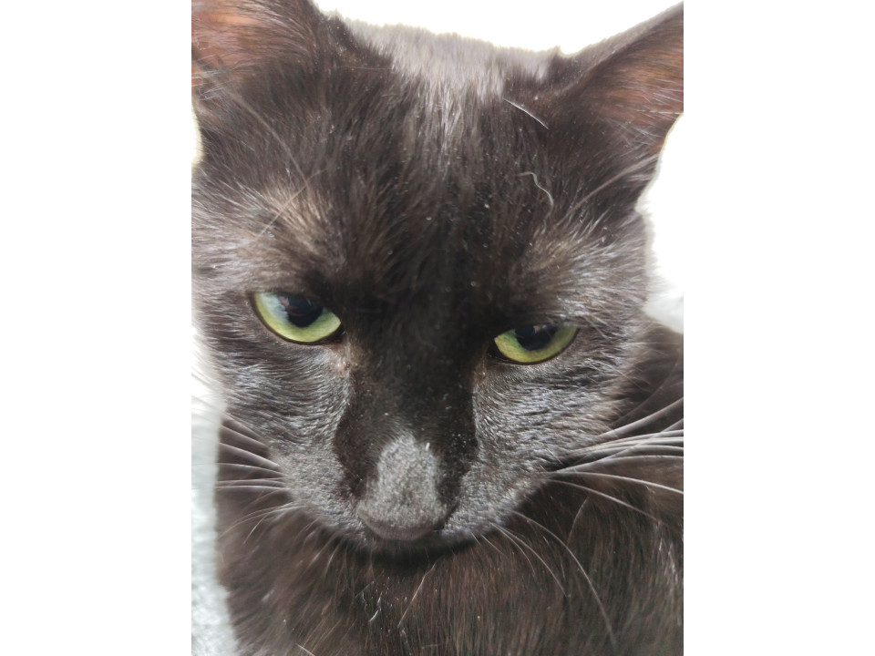 薄いシマがある黒猫、全身スレンダーで細長いしっぽ、緑がかった金目