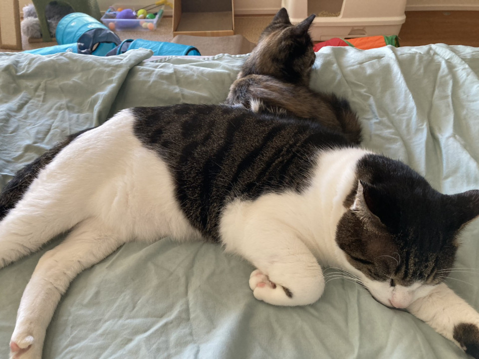 現在、後輩子猫のまるるちゃん(3ヶ月♀)と一緒に過ごしています。