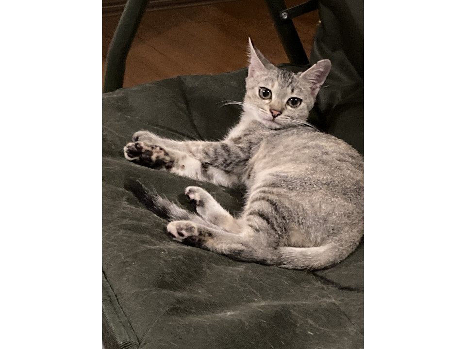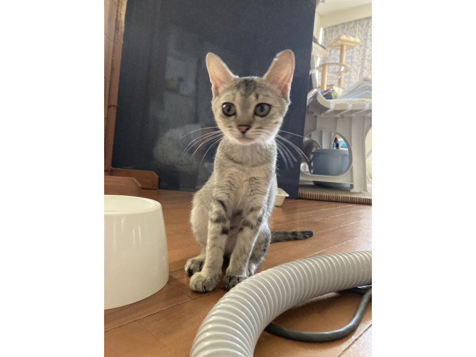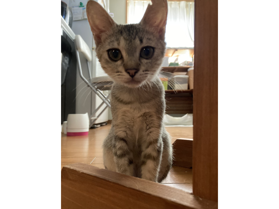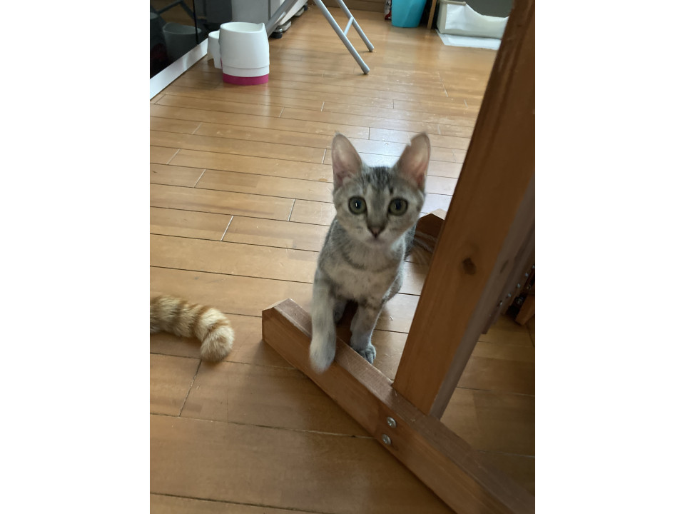 長くて細い尻尾で、左耳が少し欠けてます。