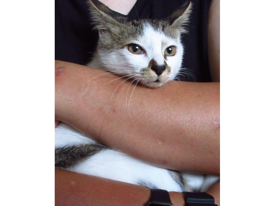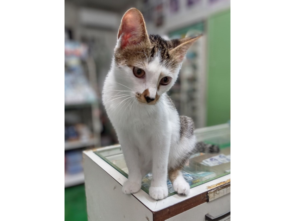 キジ白の可愛い子。 シッポは長くて先が少しだけ曲がっています。