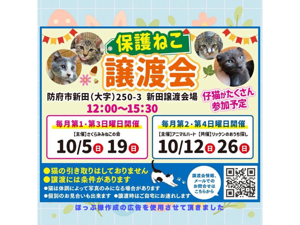 防府市新田250‐3での譲渡会に参加予定ですが、個別のお見合いも可能です。
