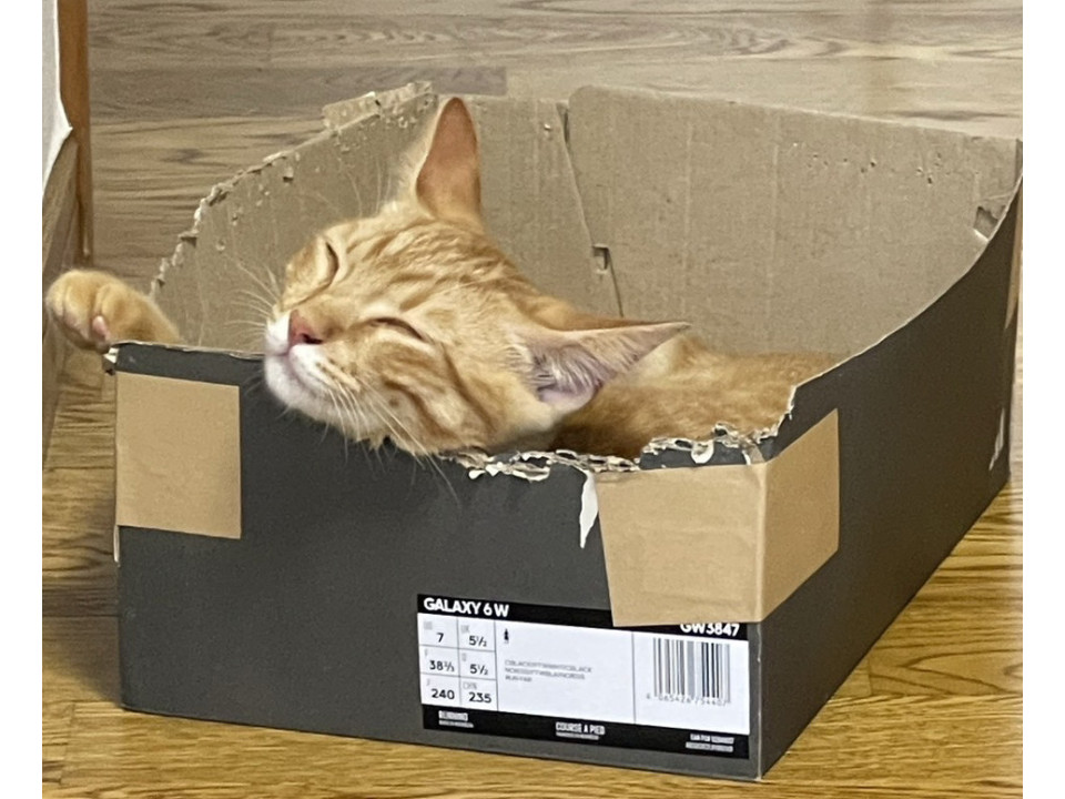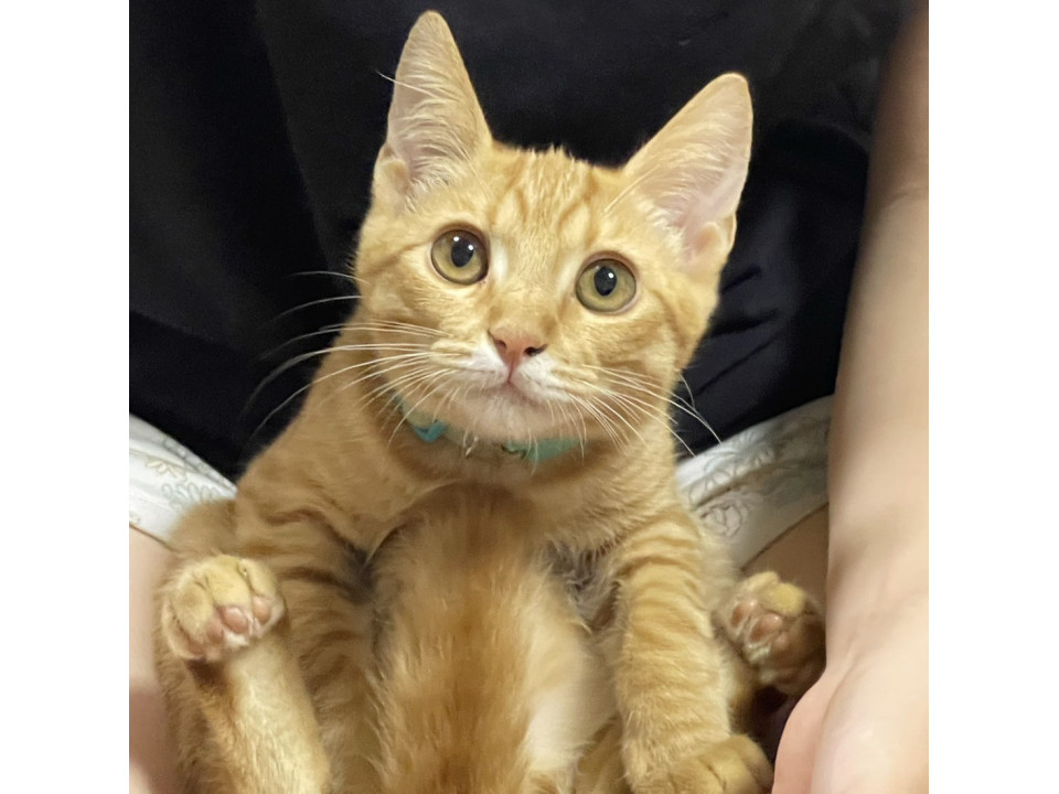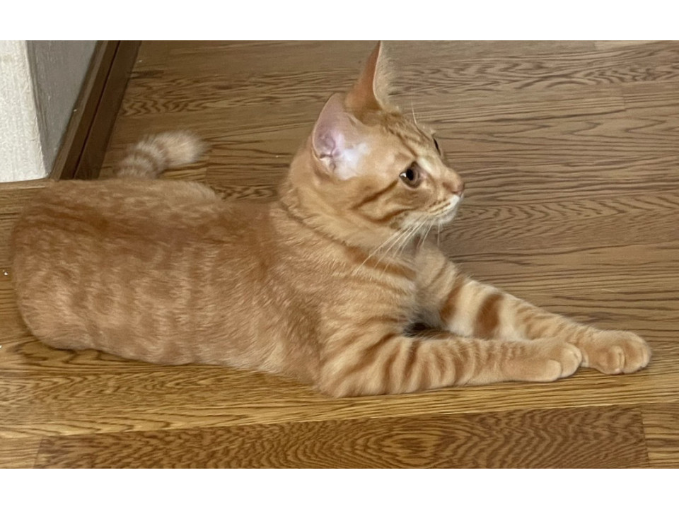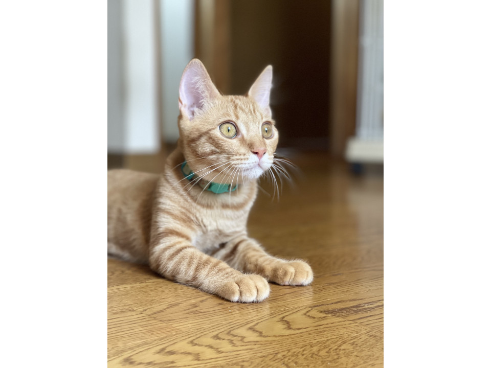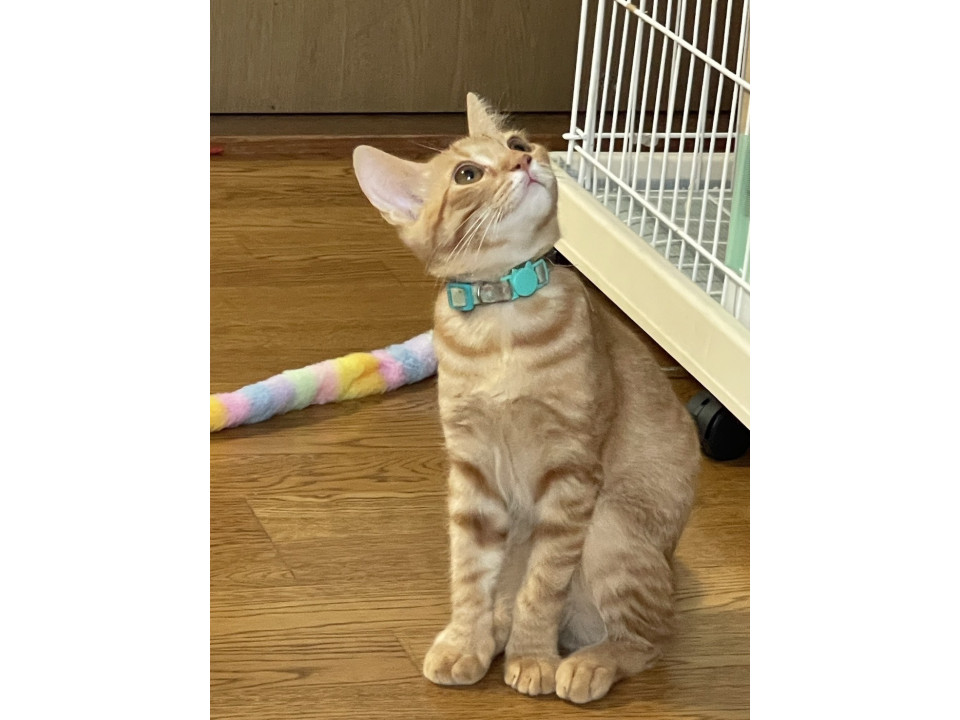 まだビビりな面がありますが、撫でるとゴロゴロいいます。成猫とよく遊び時々追いかけています!ご飯が欲しい時は大きい声で教えてくれる可愛い子です。