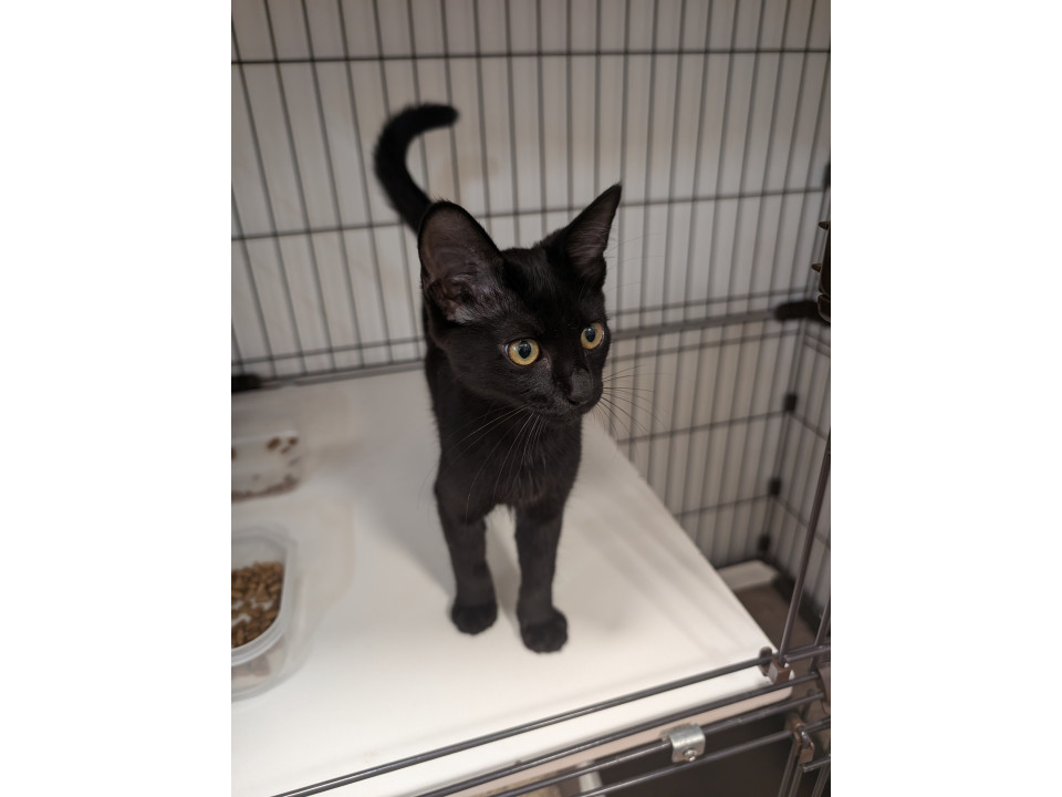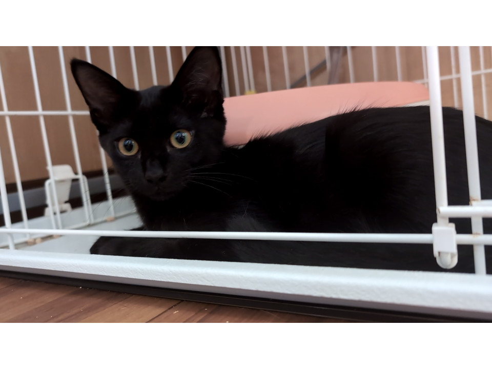 とても元気で食欲もあります。人慣れもしています。尻尾は真っ直ぐで黒光りの美しい黒猫です。