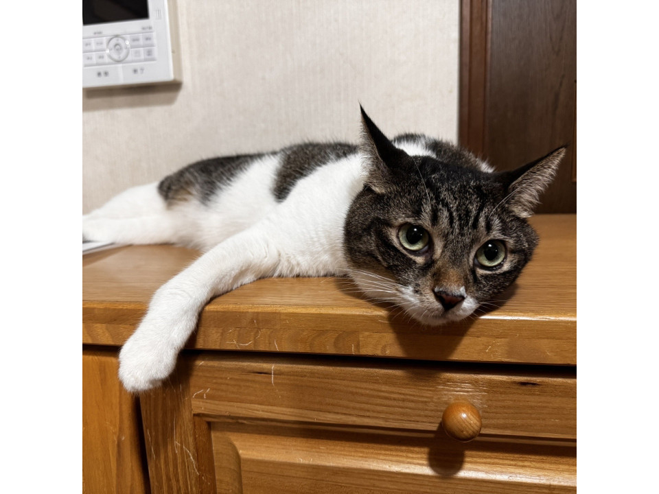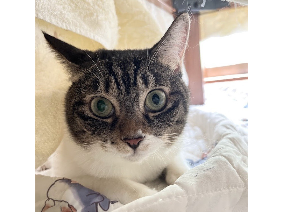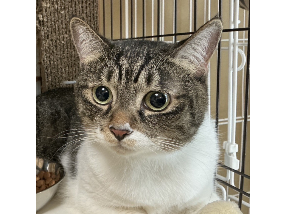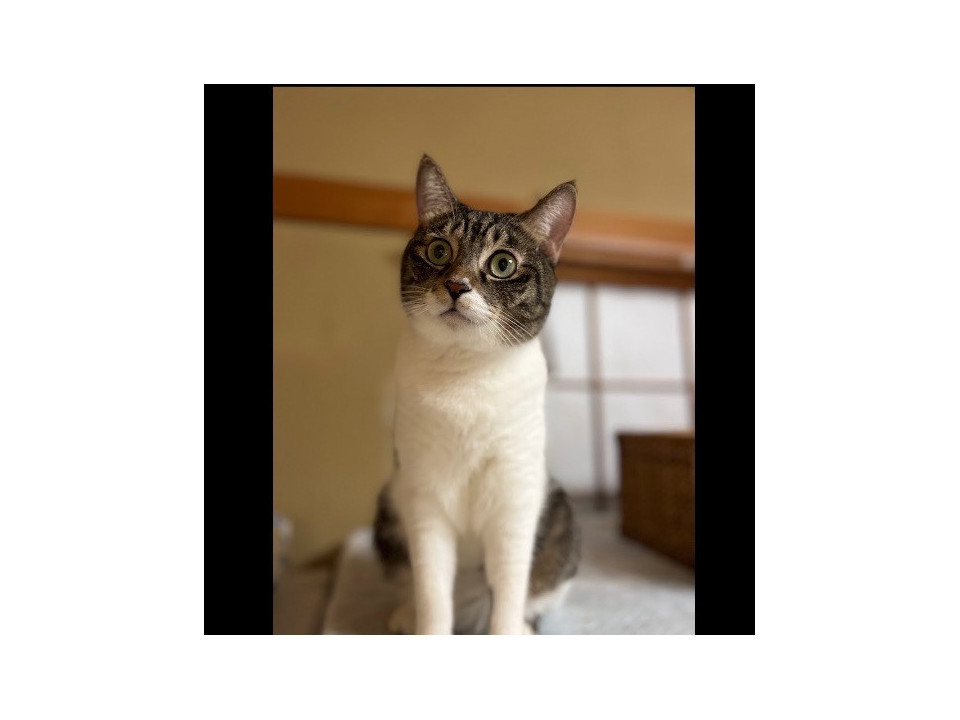 ○およそ3歳くらい(2025年8月時点)のキジ白の男の子です。プロレスマスクのような顔のキジトラ柄がチャームポイントです。
