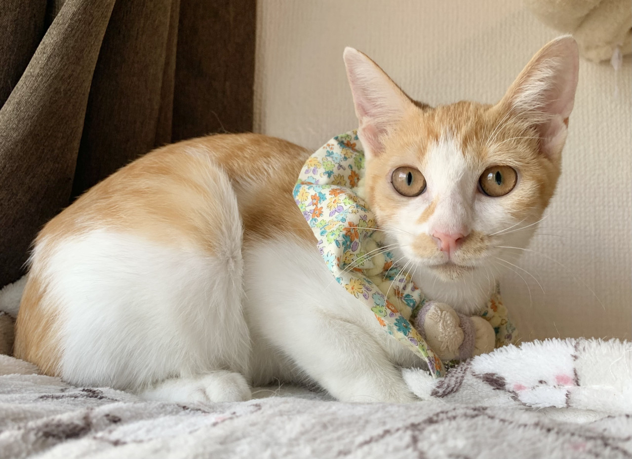 珍しい茶白の女の子で、幸運を運ぶと言われている鍵しっぽです。