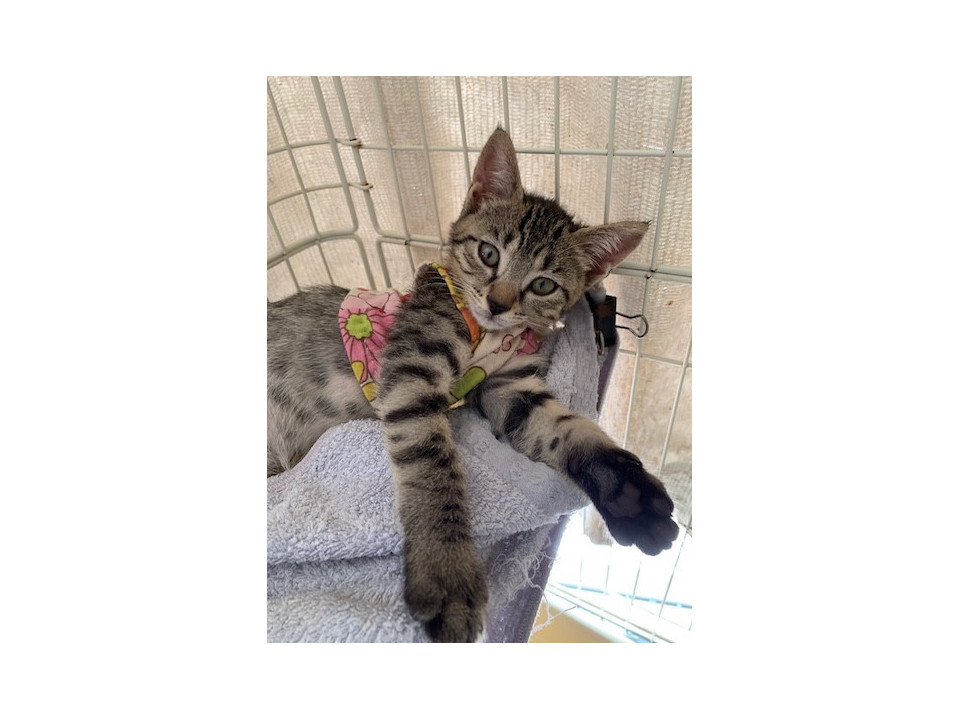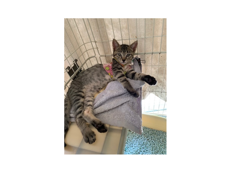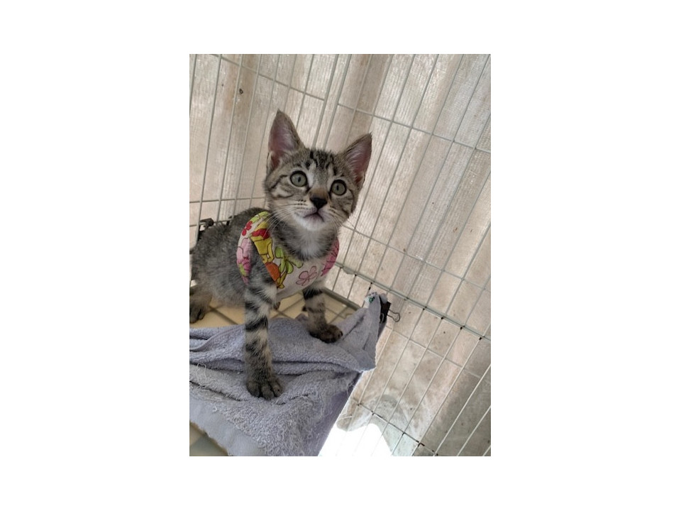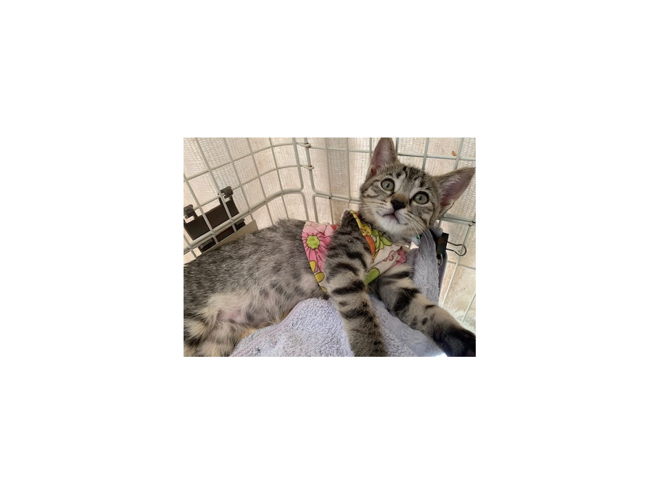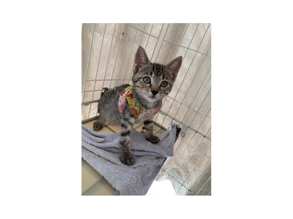 可愛いキジトラ、ウインディーちゃんです、ミルクボランティアさんにミルクから育てられたので大変人懐こいです。子猫らしく元気で活発です。
