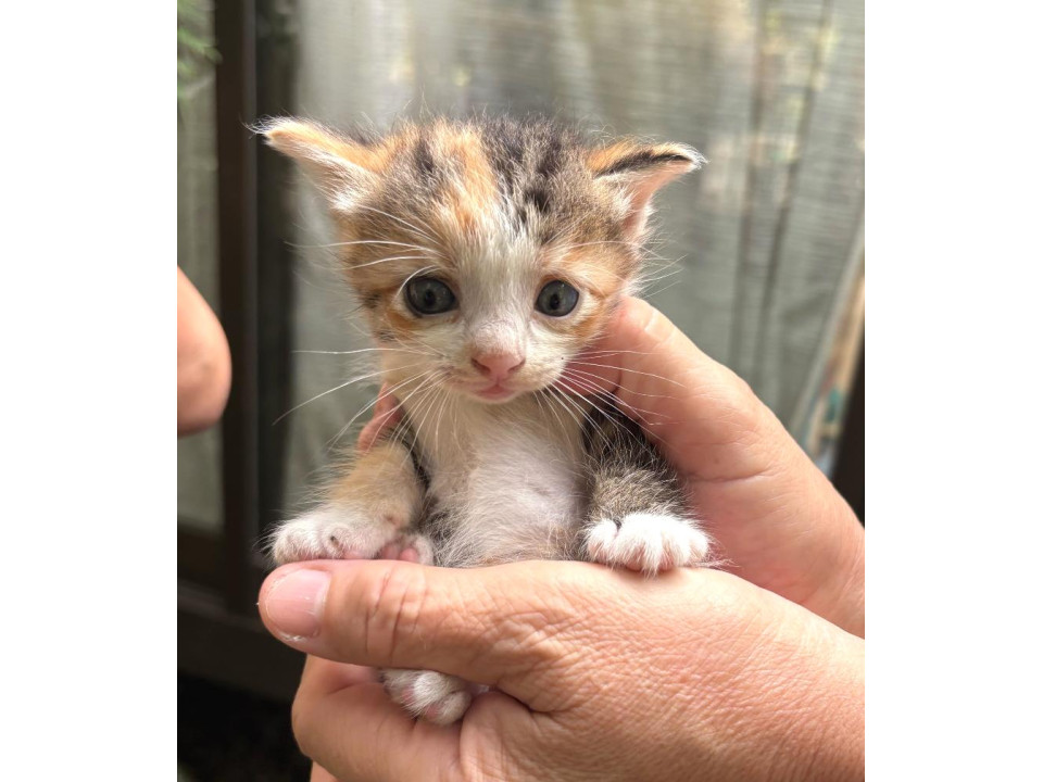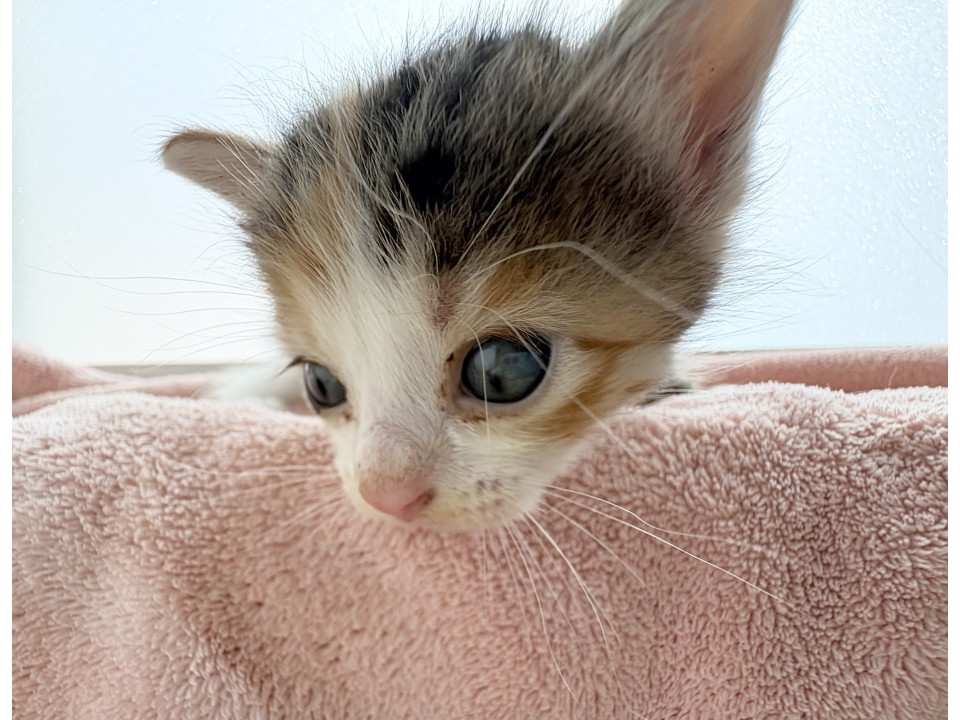 とっても丸顔でおめめがくりっくり。なんとも愛らしい三毛猫ちゃんです。