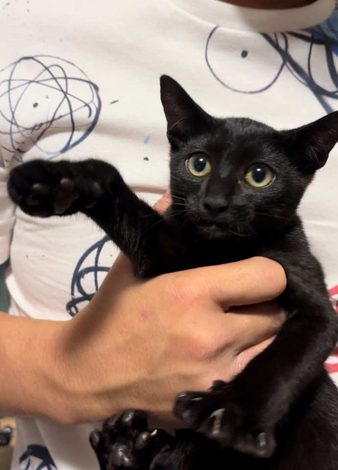 ハチワレママとキジトラパパの間に生まれた黒猫です。今のところ、腕や脚が長めで顔の輪郭もシュッとしています。しっぽの長さはやや短く、20cmないくらいです。声は高めでハチワレママそっくり、女の子のような鳴き声です。