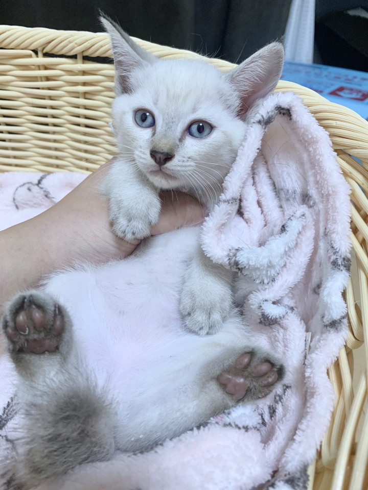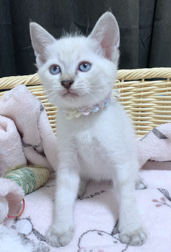 耳と尻尾の先が模様のあるシャム風の女の子です。ブルーアイが可愛いです。