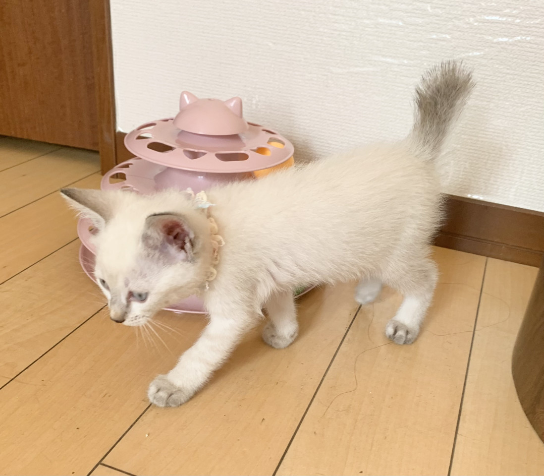 元気いっぱいで、おもちゃや他の猫とたくさん遊びます。