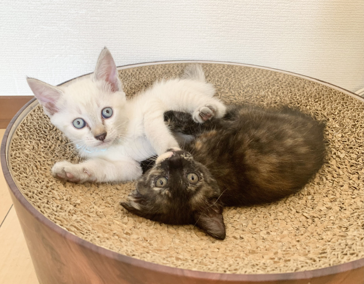 (茶トラの女の子、シャム風男の子、サビの女の子、黒の女の子です)