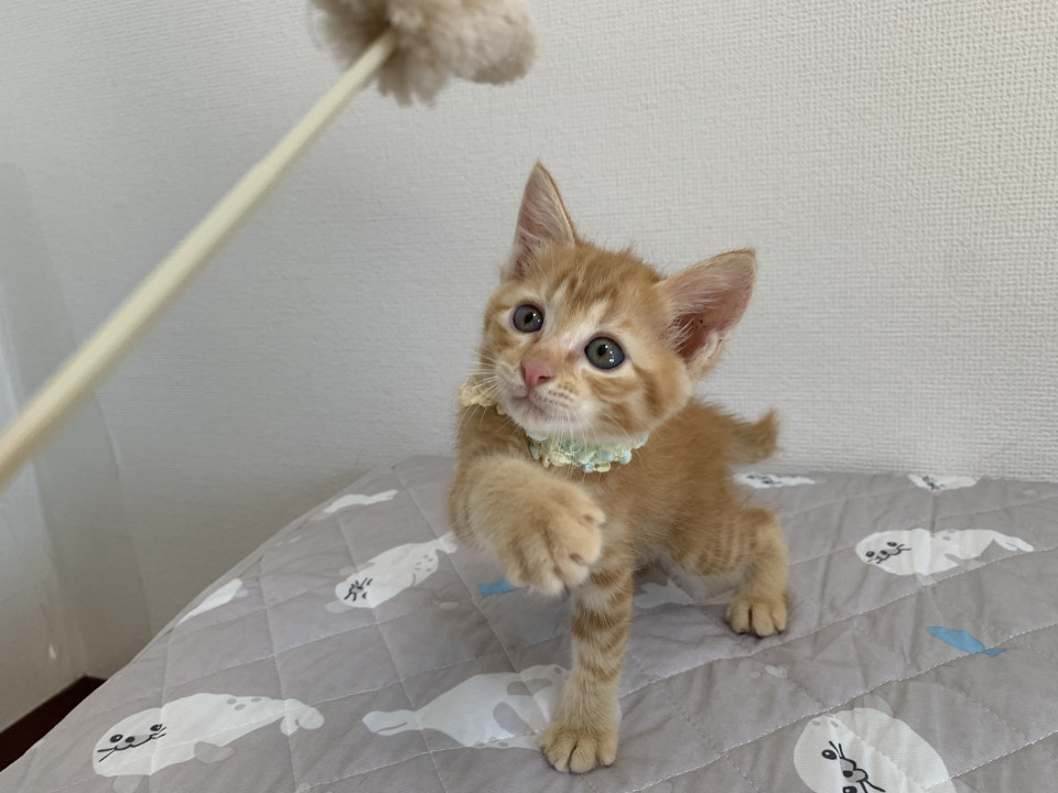 元気いっぱいで、おもちゃや他の猫とたくさん遊びます。