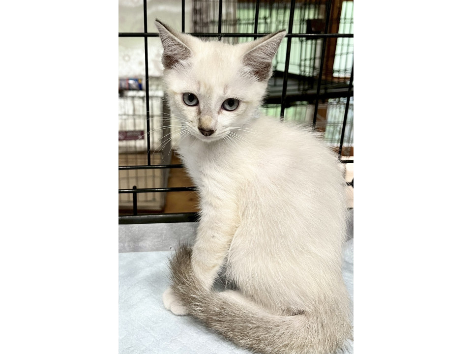 耳と尻尾の先が模様のあるシャム風の男の子です。珍しいブルーアイが可愛い、かすたどん君です。