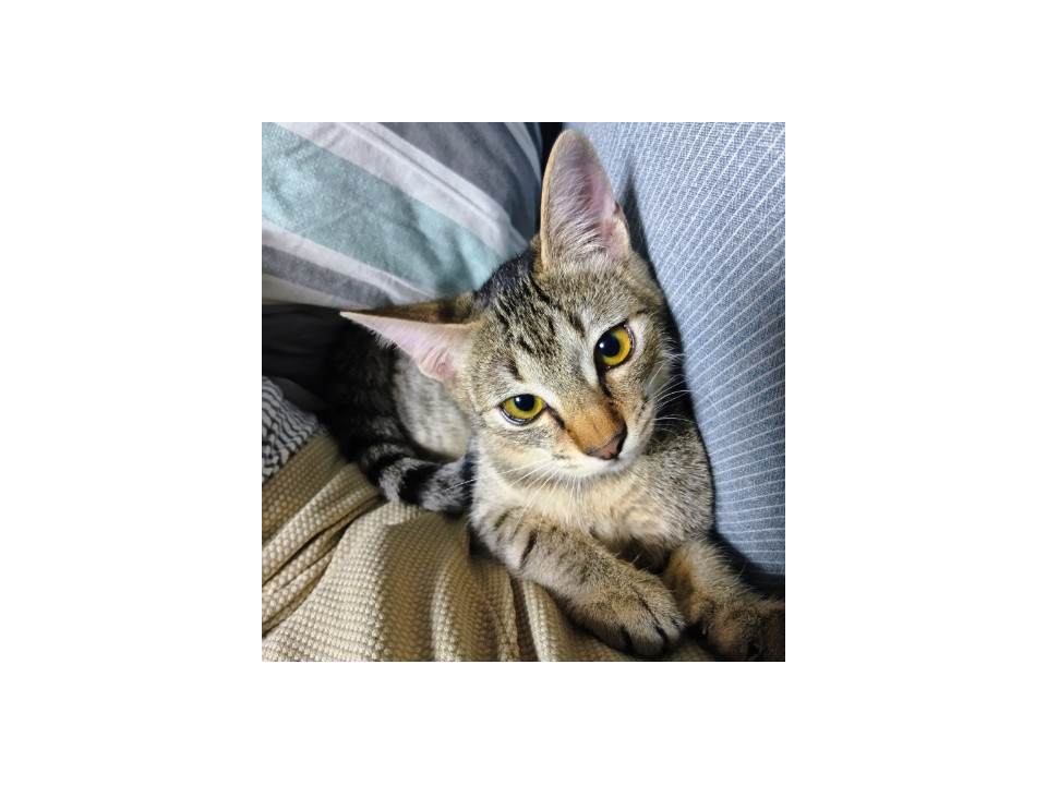 スラリとした手足に長い尻尾、滑らかな短毛できれいなキジトラの女の子です。