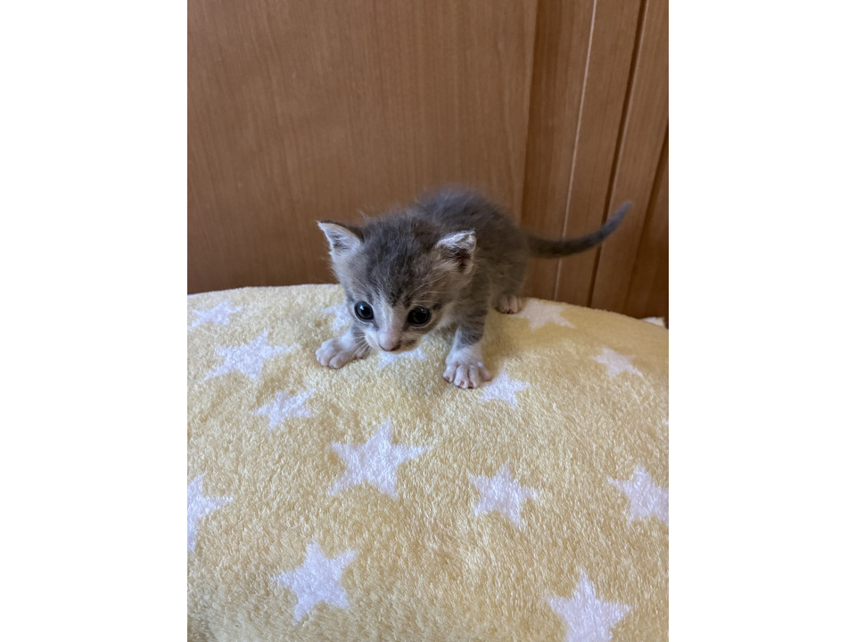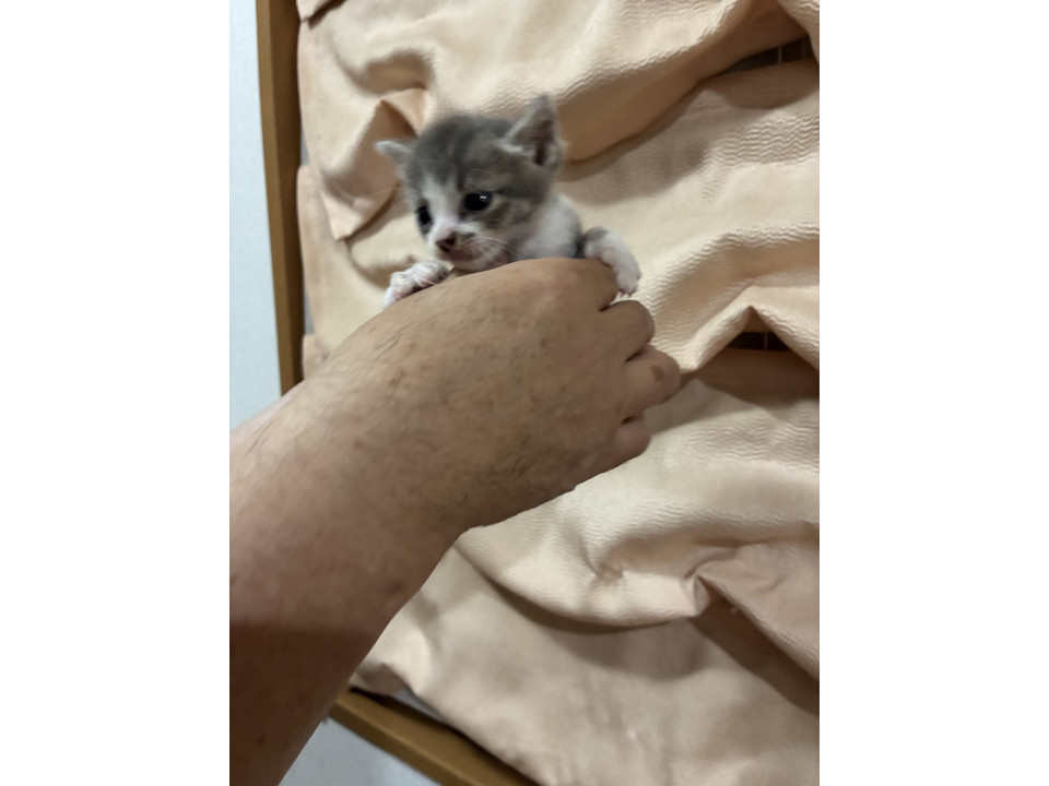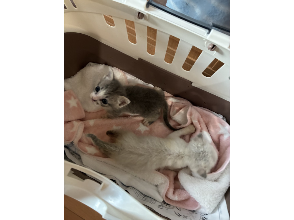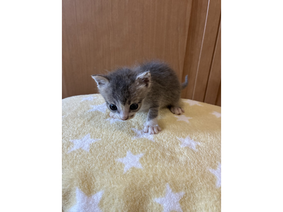 きょうだいのうち一番小柄な状態での保護になります。先に濃い色のキジトラの譲渡が決まり現在二匹で過ごしていますが、シャム系の白に比べて小さめです。通常預かりしますキジトラに比べてグレーぽい薄めのキジトラになります。