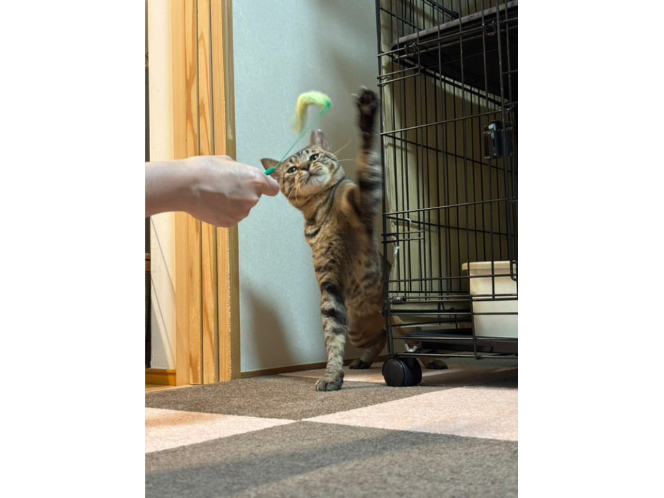 キャットステップでくつろいだり、猫じゃらしや、トンネルで兄弟のたくちゃんと一緒に遊んでいます。