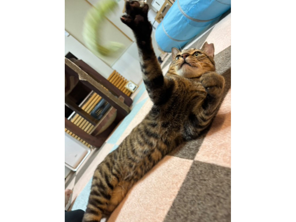 遊ぶのも大好きで、猫じゃらしや、トンネルで遊んでいます。