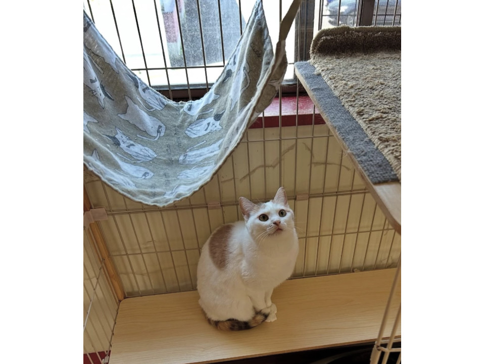 飼い主さまのご事情により、昨年5月から保護猫カフェ「猫婆」で暮らしています。元の飼い主さまのお話では、抱っこもできて膝の上にも乗るそうです。甘えん坊で、猫じゃらしで元気に遊びます。