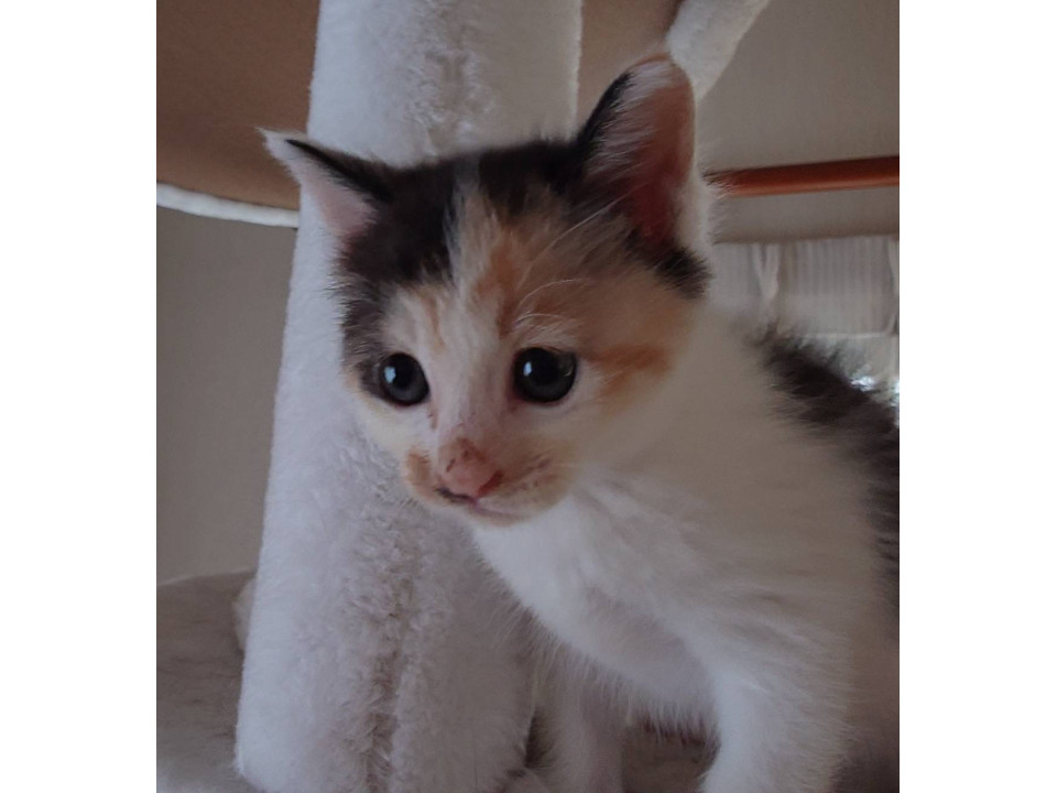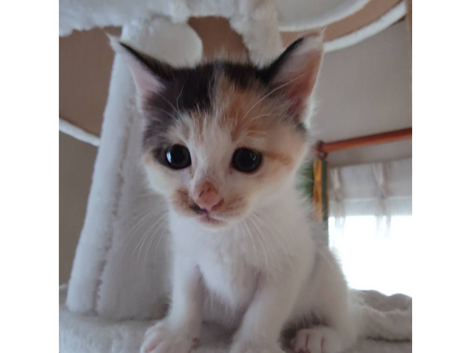 三毛猫さんなのですが、黒色が控えめで、茶色の毛色も淡めのトーンです。お背中の模様はお写真で確認してください(9/24撮影)お顔の目元の茶色いクレオパトララインがやや下向きになっています。そのためちょっとタレ目に見えるところがチャームポイントです
