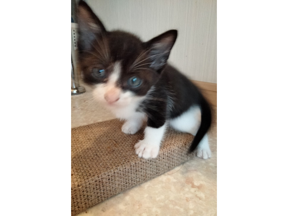 ハチワレ。眉毛が立派です。生後2日後から母猫ごと保護した為、栄養状態良く性格もおっとりしています。