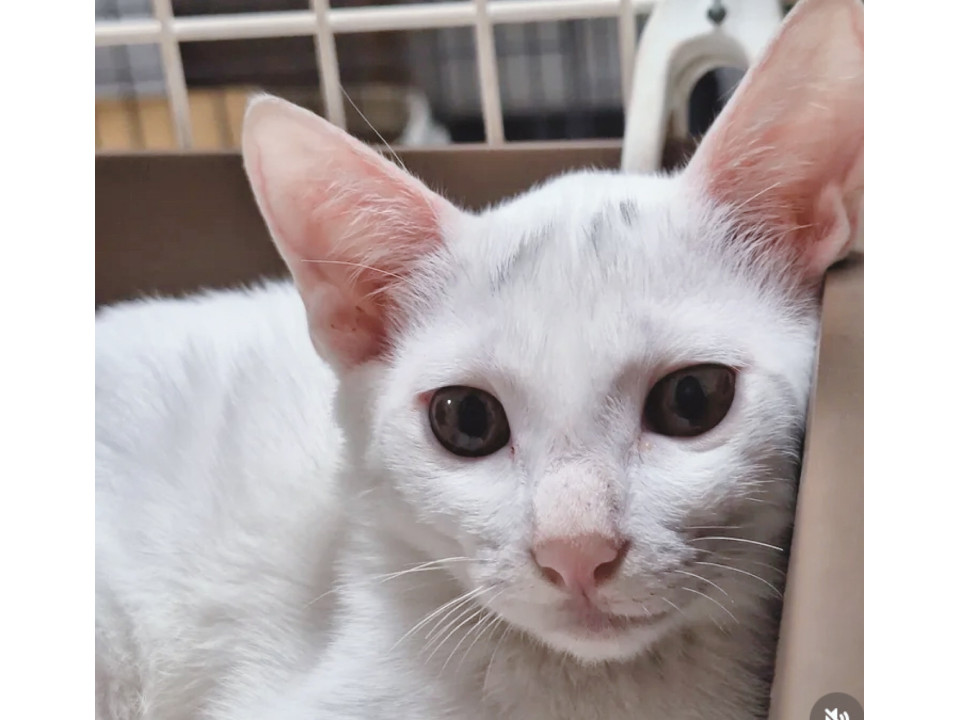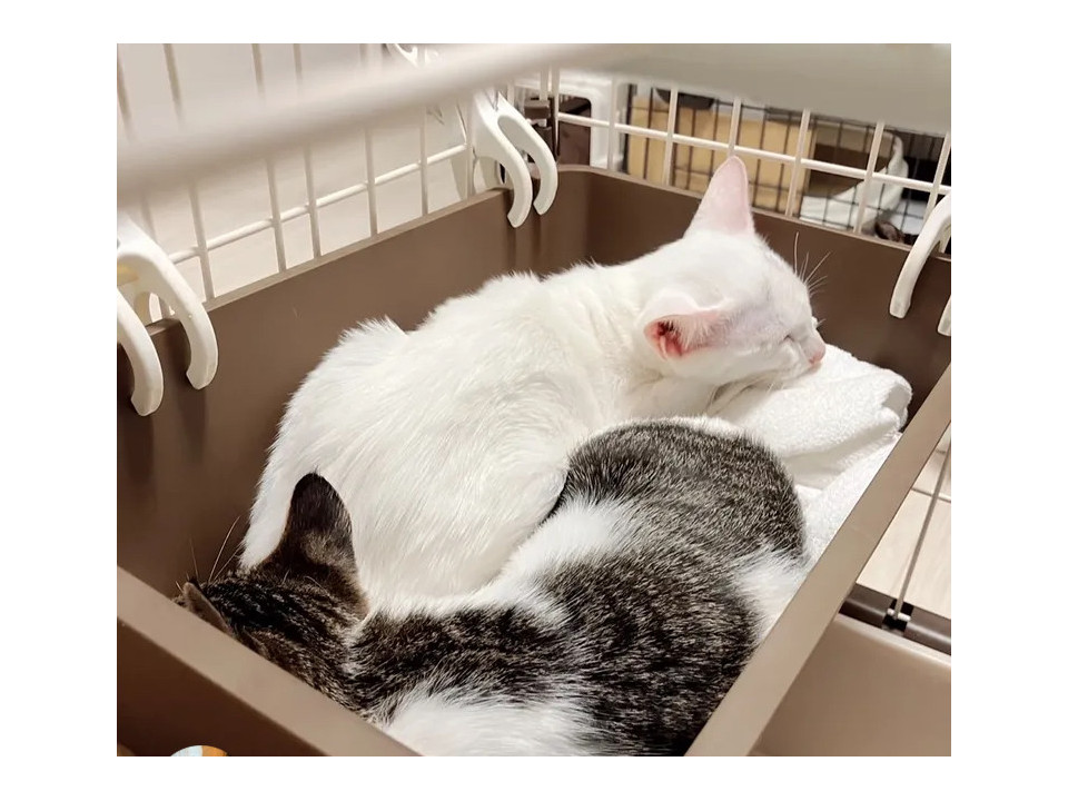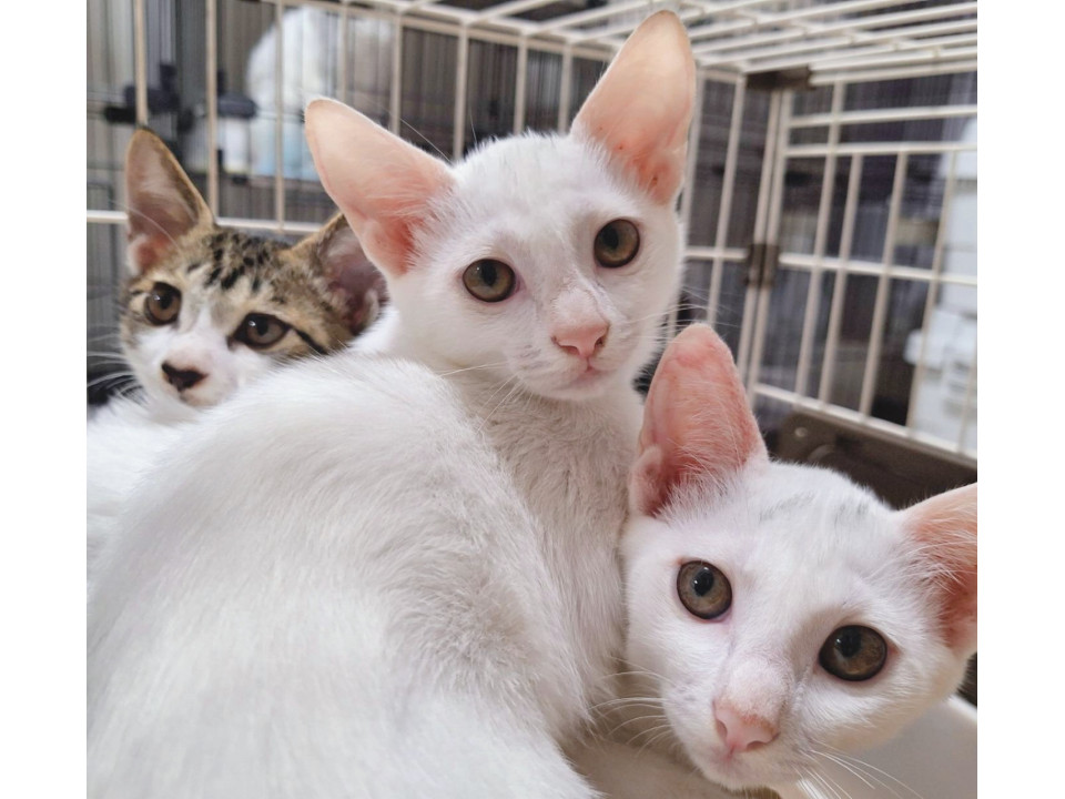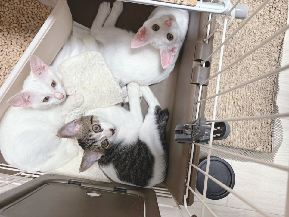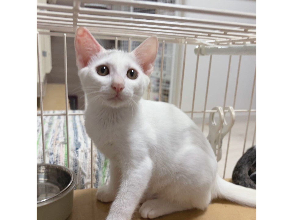 現在は、一緒に保護されたきょうだい(キジシロ猫ほおづき♂・白猫うさぎ♀)と仲良く暮らしています。