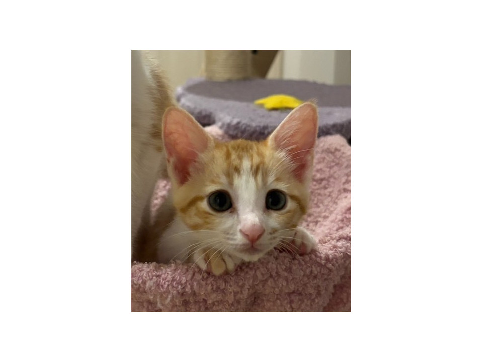 綺麗な茶白模様の正統派の美猫ちゃん。しっぽは長く、鼻、肉球ピンクです。