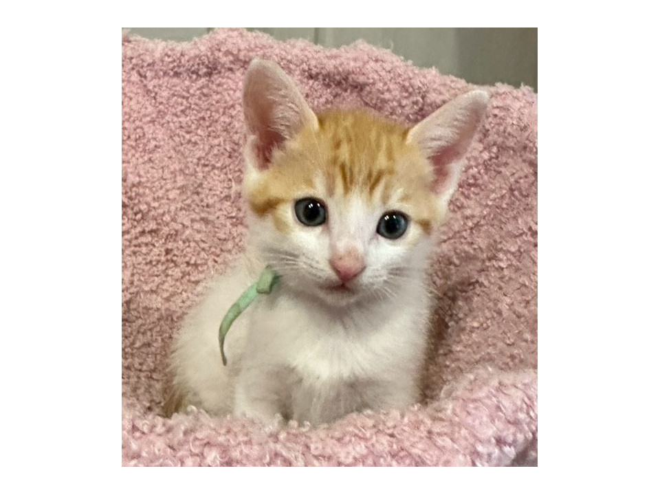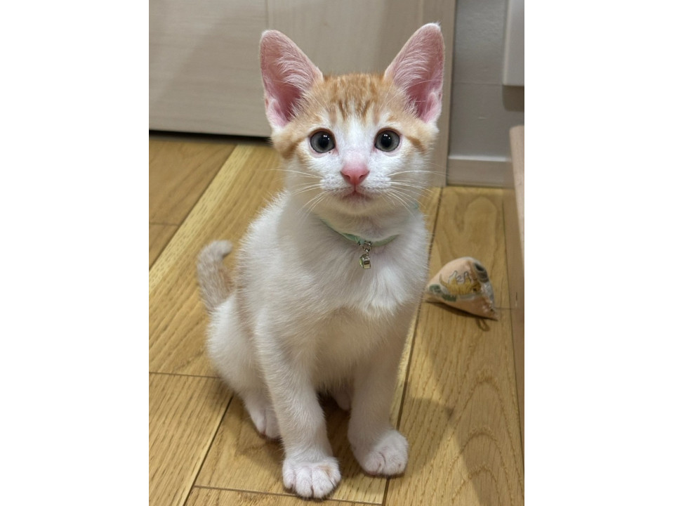 白多め、茶白模様の綺麗な男の子です。しっぽは長く、鼻、肉球はピンクです。