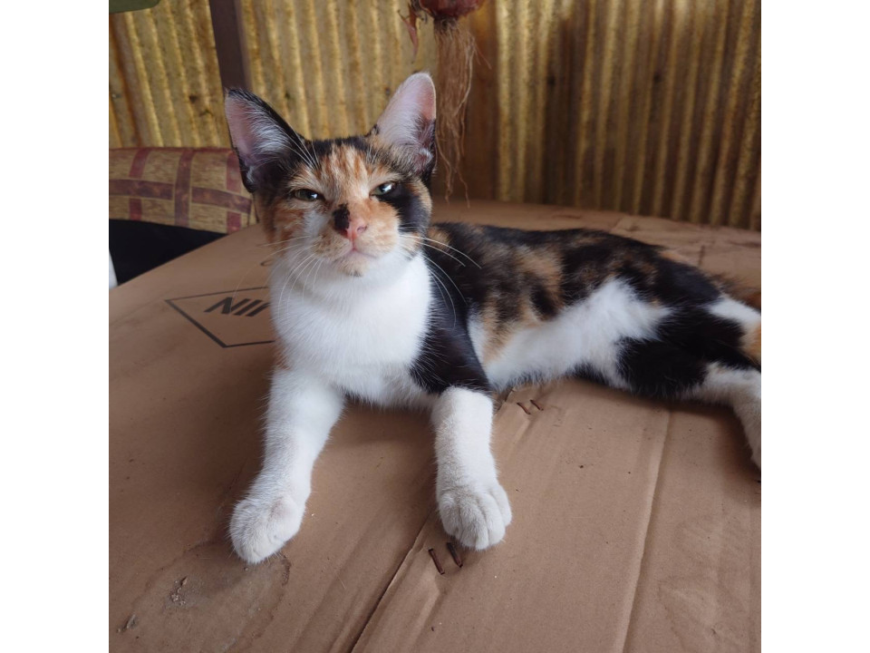 クリーム柄のシャムオス2匹、三毛メス1匹匹、シャムメス1匹、黒オス1匹の5匹兄妹と三毛猫のお母さんになります。