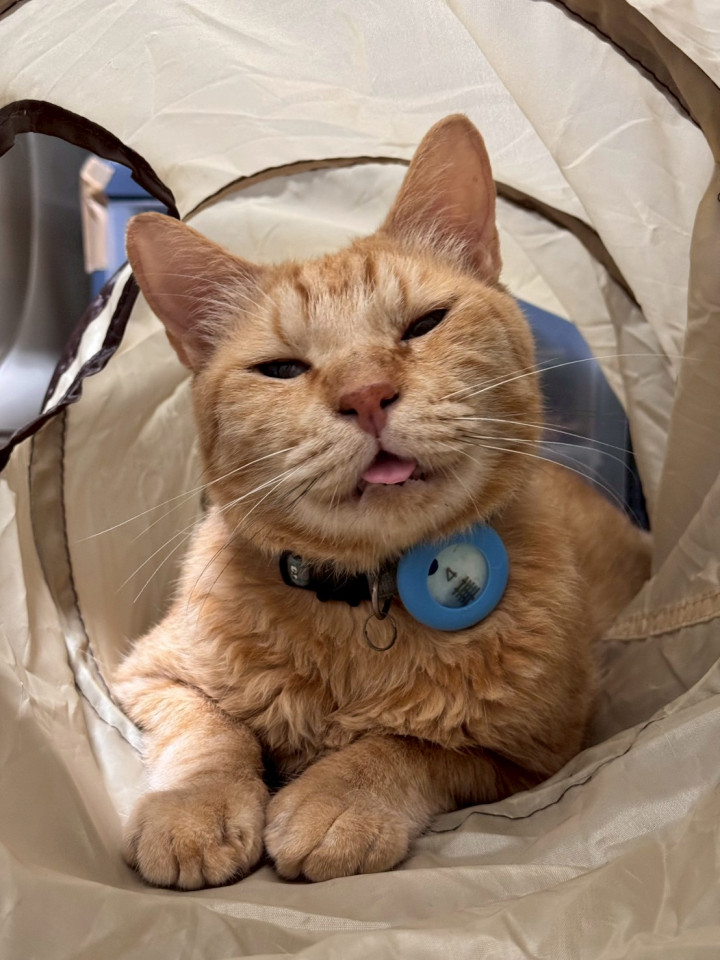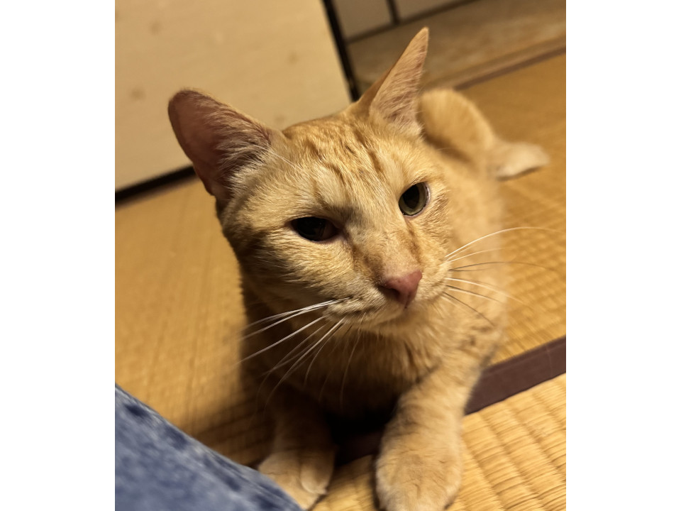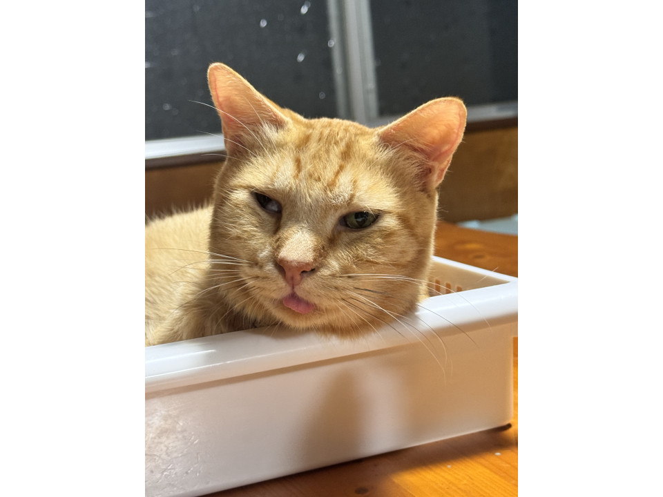 保護時は猫風邪を引いており、長期間未治療であったため右眼瞬膜は開ききらず1/3程突出しています。