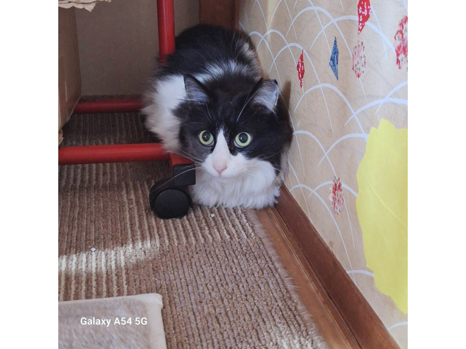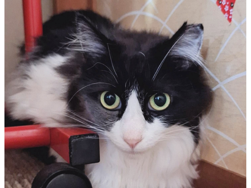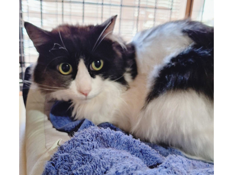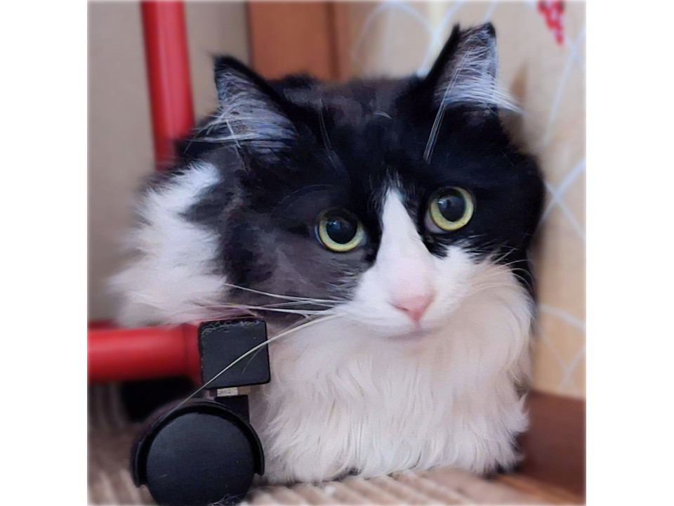 ゴージャスな雰囲気の長毛黒白猫ふわちゃん。推定8歳の女の子です。