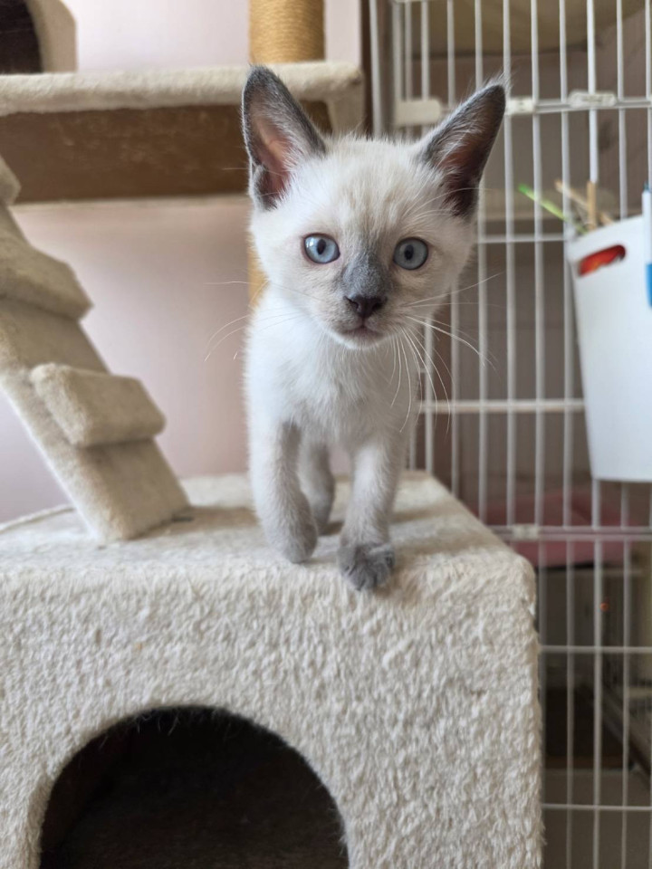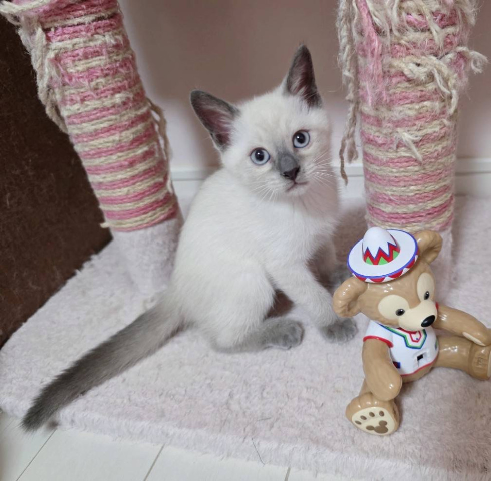 ブルーの瞳がとても綺麗なシャムミックスの男の子です。大変人馴れしていて、甘えん坊でお膝に乗ってきたり、肩に乗ってきたり、とても可愛いです。先住猫との相性も良く 穏やかで落ち着きのある子です。