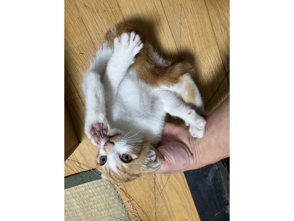 半月ほど前に庭先で見かけてから雨の日に軒先にやって来るようになり、さらにはクルマのエンジンルーム内にいたのをみつけて、このまま近所で野良猫化しては不憫なので屋内に保護しました。母猫はみあたりません。