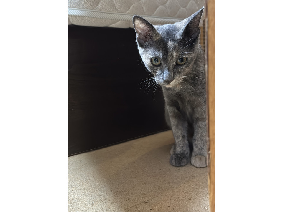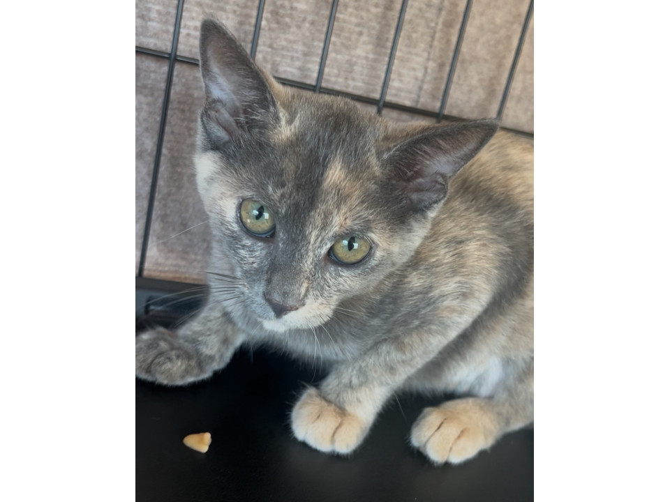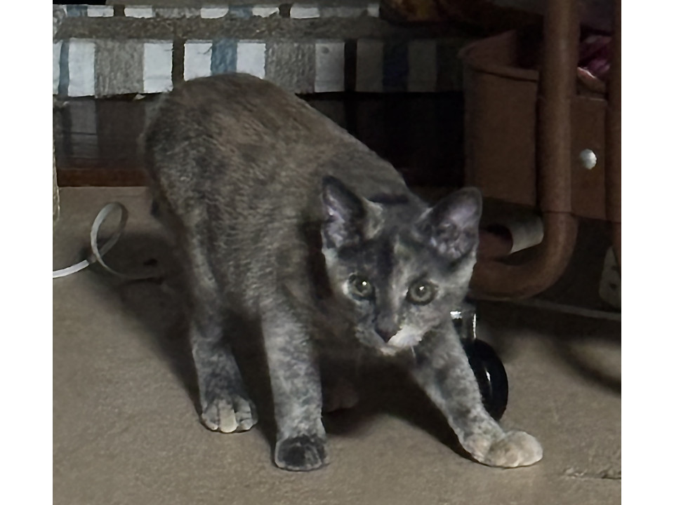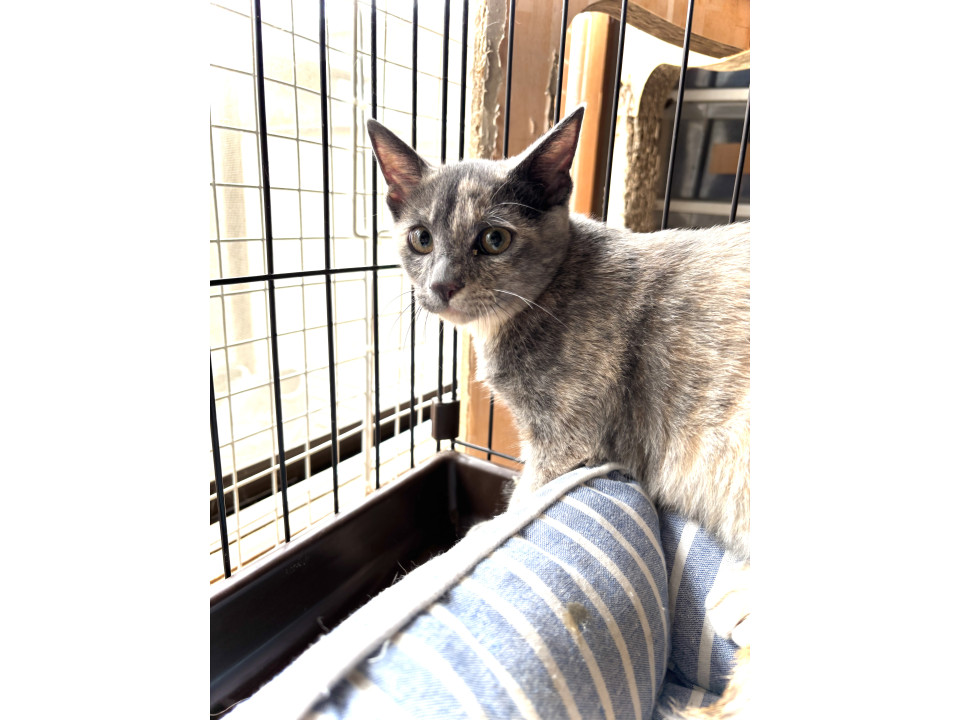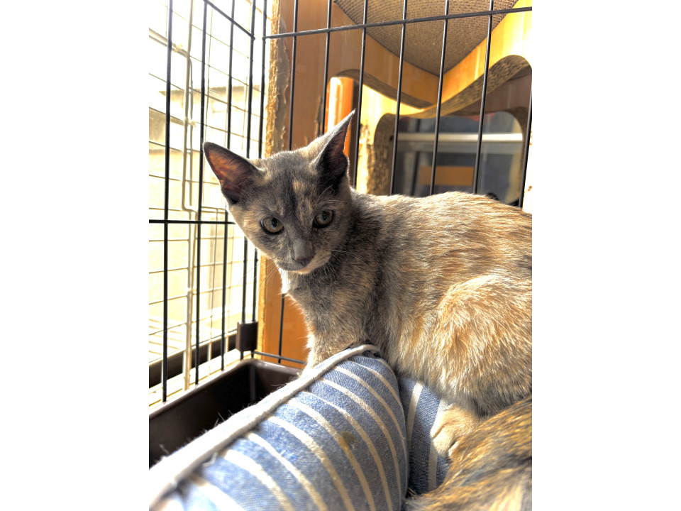 お姉ちゃんであろう兄弟の後ろにいつもいて、怖がり。でも、おいしいものやおもちゃにつられてでてきちゃう、可愛い子です。攻撃はしません。シャーはします。クルンとなった短いしっぽが可愛いですよ