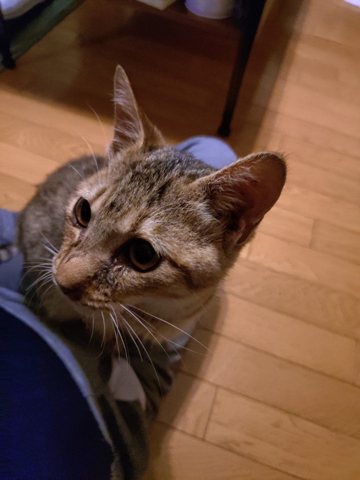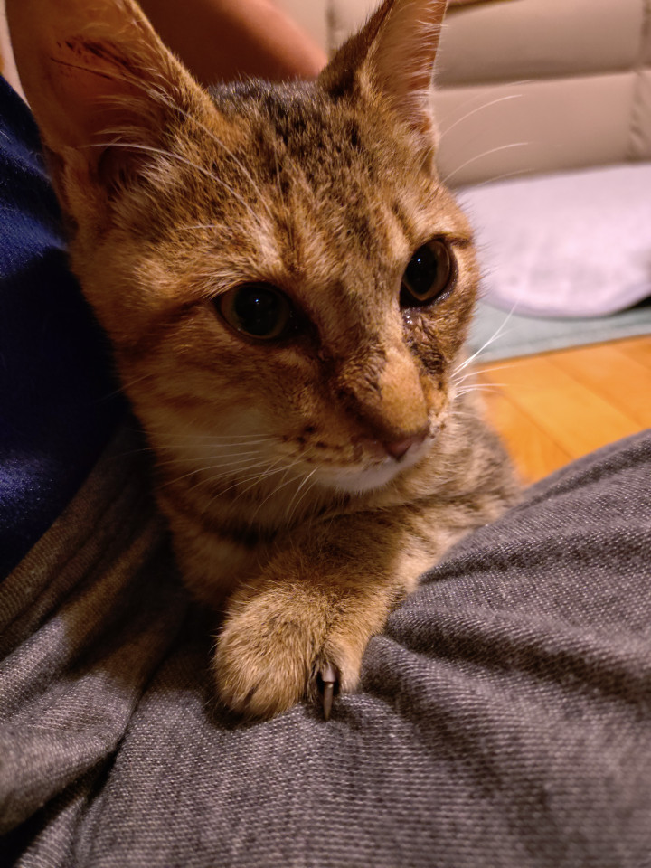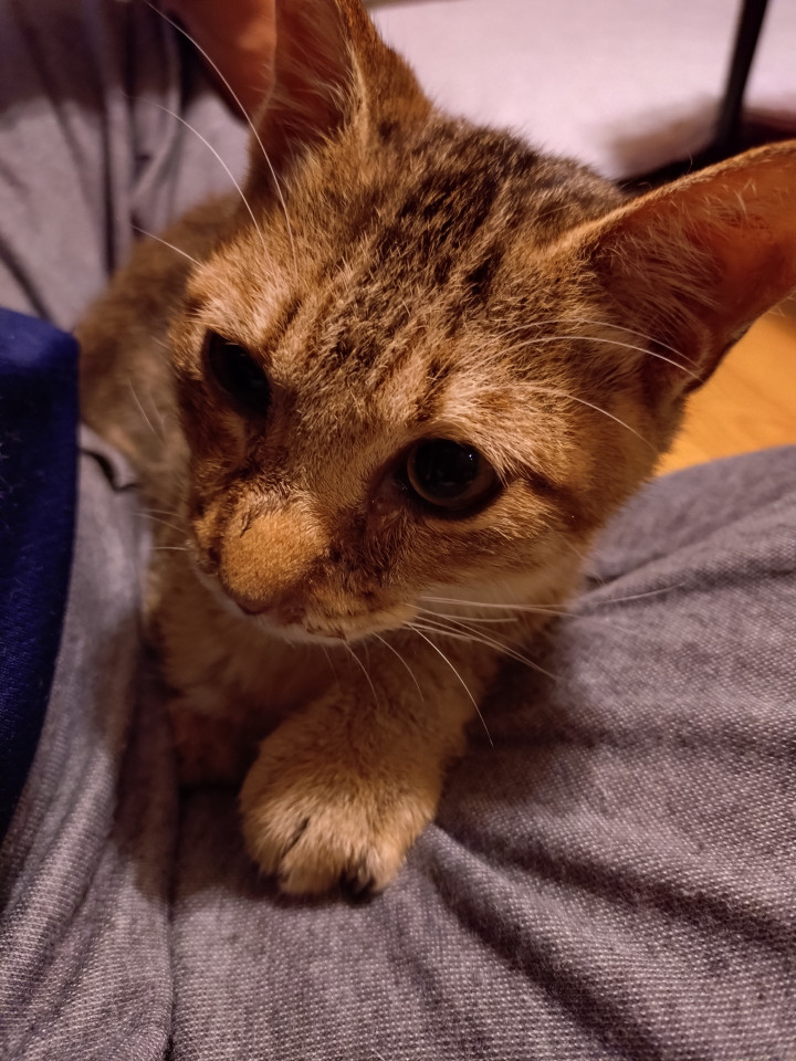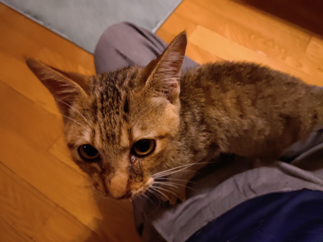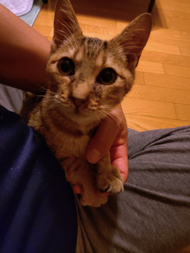 夜、帰宅途中に自宅近くの田舎道路の真ん中に子猫が座っているのを発見し、車をゆっくり近づけましたが全然逃げる様子がなかったので、子猫を道路の外へ連れ出しそのまま帰宅したのですが、翌朝出勤時になってもまだ同じ場所に座って居たので、自宅車庫へ連れ帰り、ダンボール箱と餌を置いて1日様子をみてみましたが、他のノラ猫が集まってきたり、カラスに襲われたり、他の車にひかれてもと思い保護しました。