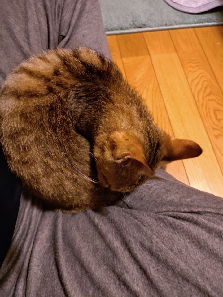 家中どこに行くのもそばについてきて、疲れたら膝の上でまったり寝ています(笑)
