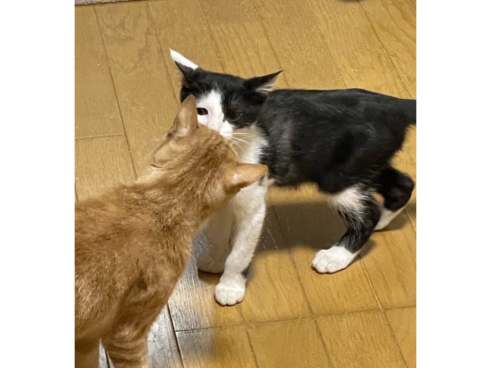 後輩猫には手厳しい(遊び)面がありますが、威嚇はしません。