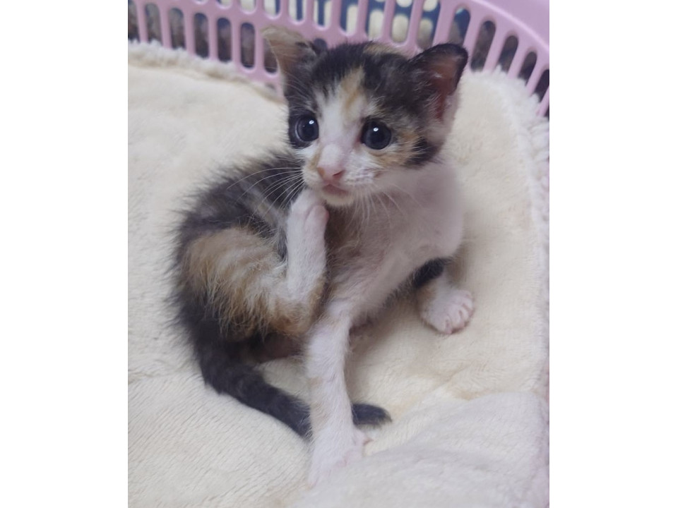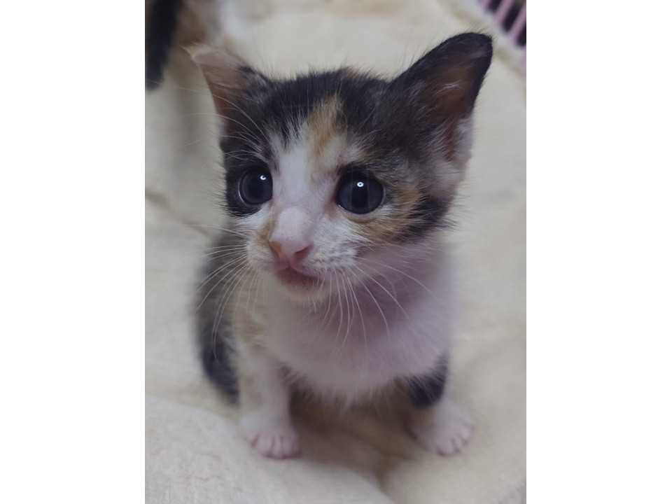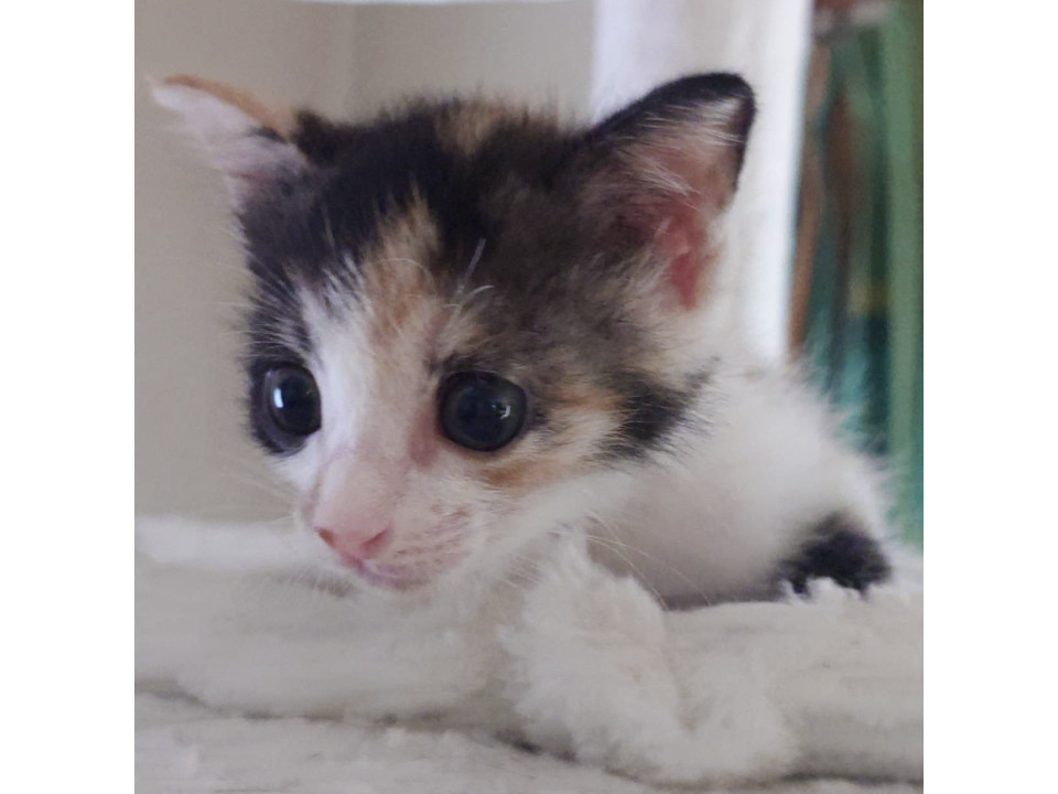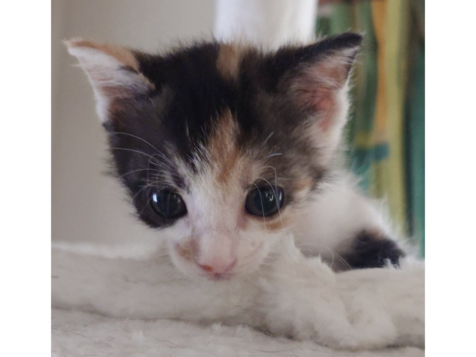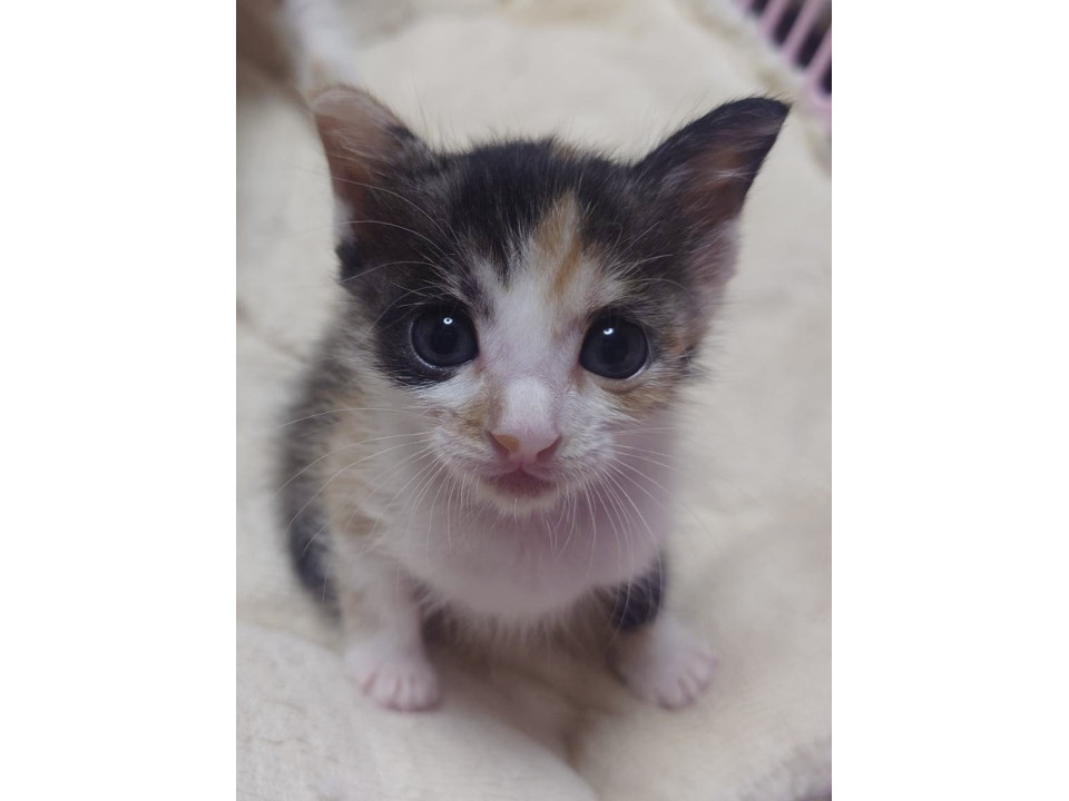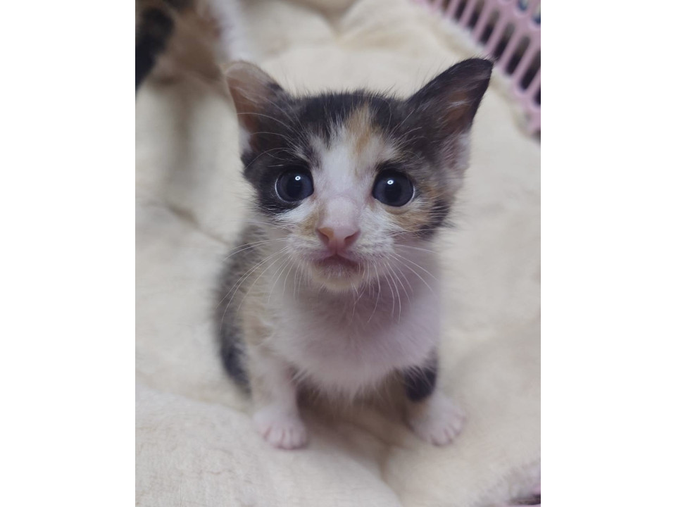 三毛猫さんなのですが、茶色の毛色も淡めのトーンなのでパステル三毛ちゃんに近い色味の毛色です。お顔を見る角度によってはちょっとタレ目に見えます。正面から見たら小顔で目がデカっってなります笑。ちょっとモフッとしていいるところも今後どんな風に変わっていくのか楽しみです。長毛さんにはなりません。