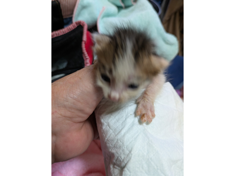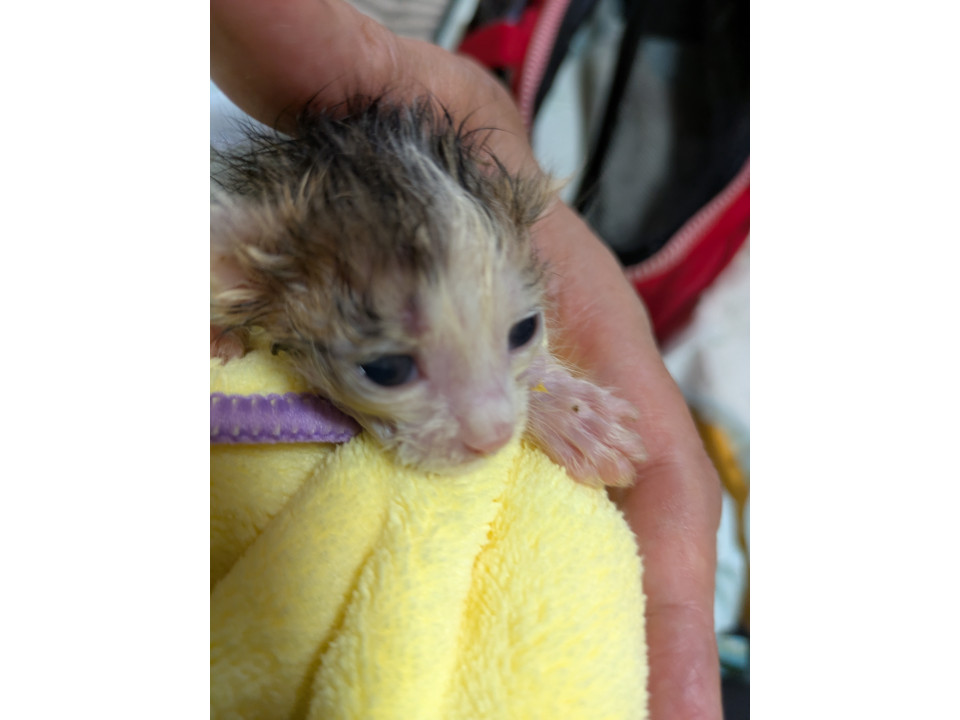 赤ちゃん猫の鳴き声がしていたから、保護をした!っと言う方から、御連絡を頂き、動けない状態だった為、引き取りました。育児放棄の様で、母猫の姿を見た方も居ませんでした。臍の緒が取れ、目も開き、とても可愛くなってきています。