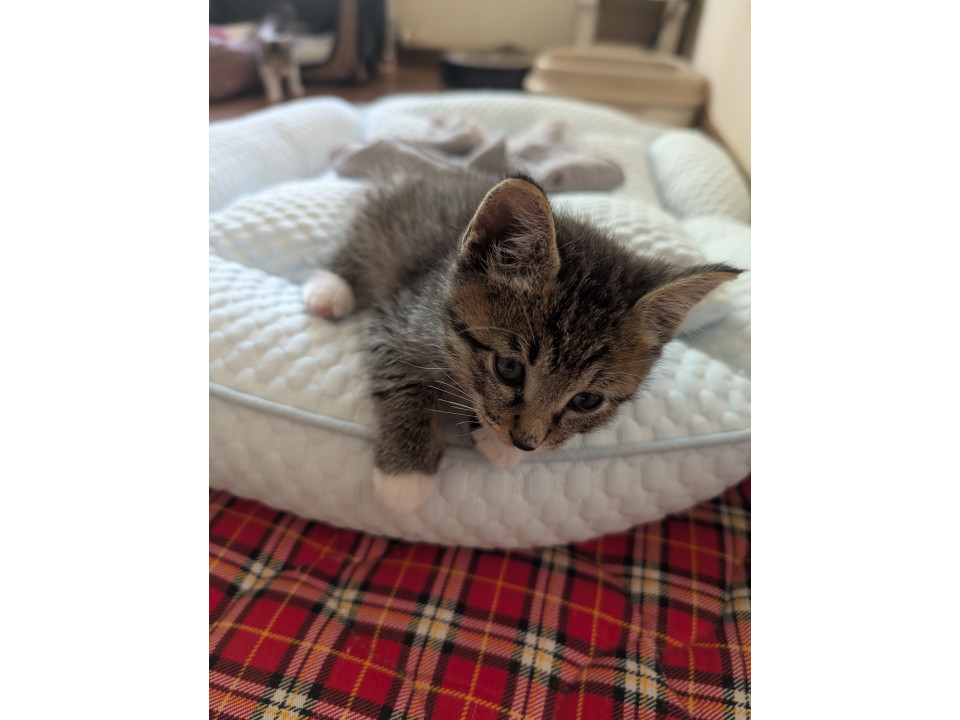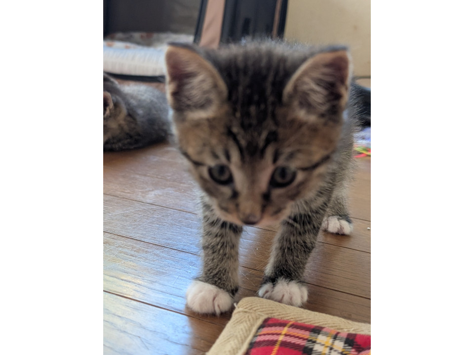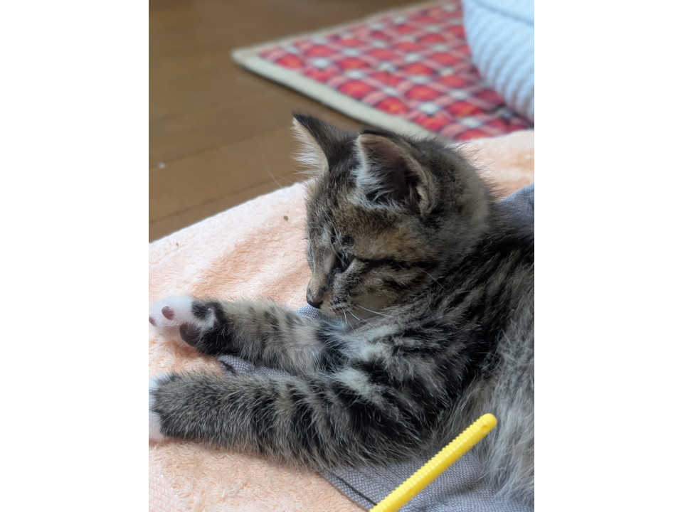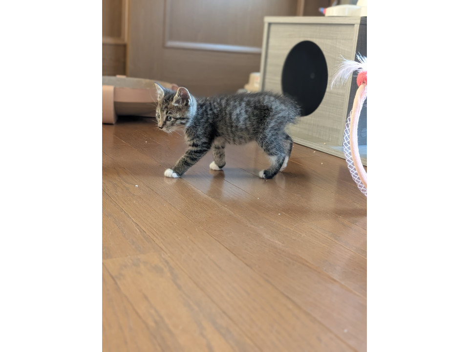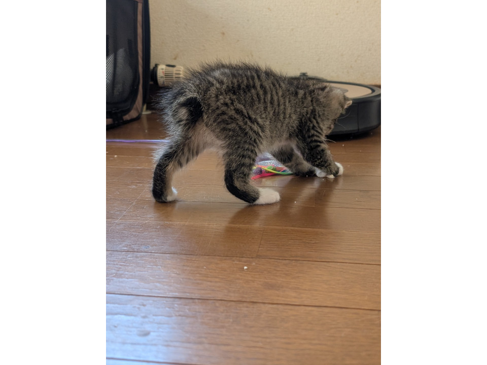 くるりとカールしたしっぽがとてもキュートで、白い足先はドラえもんのてってのよう。兄弟の中では活発で、先頭を切るリーダータイプ。我が家のおばあちゃん猫とも、上手に付き合ってます。モチロン甘々チャンです。