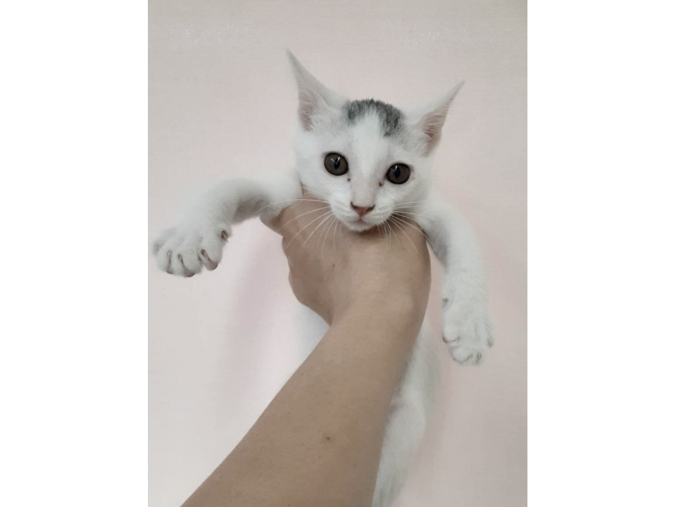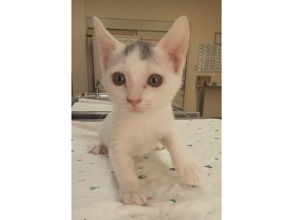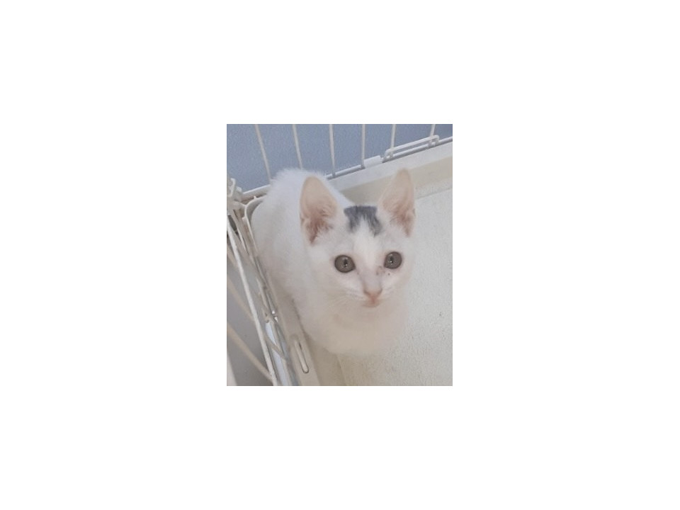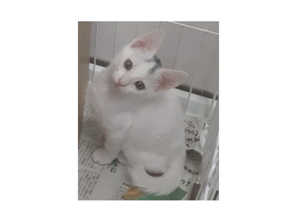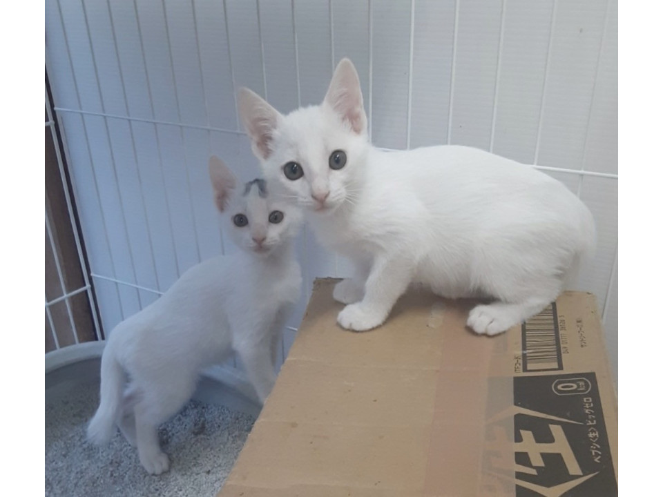全身真っ白ですが、頭にキトンキャップがあります。割とサイズが大きめのキトンキャップなので、これはそのまま残るのではないのかなと思われます。成長するに従ってサイズや色味に変化があります。ご了承ください。他は真っ白です。白猫さん自体個体数が少ないので、レアな兄妹さんだなと思います。(3兄妹です)